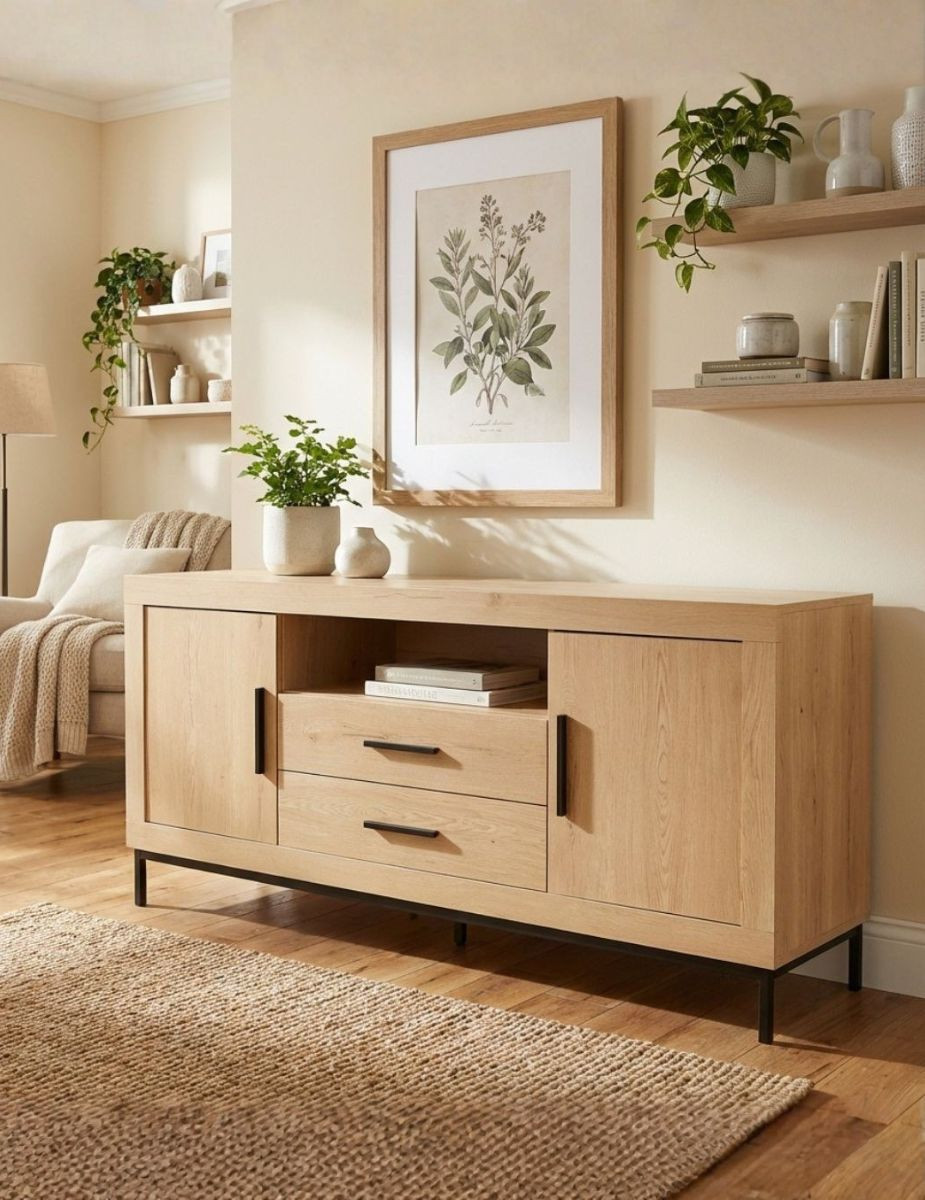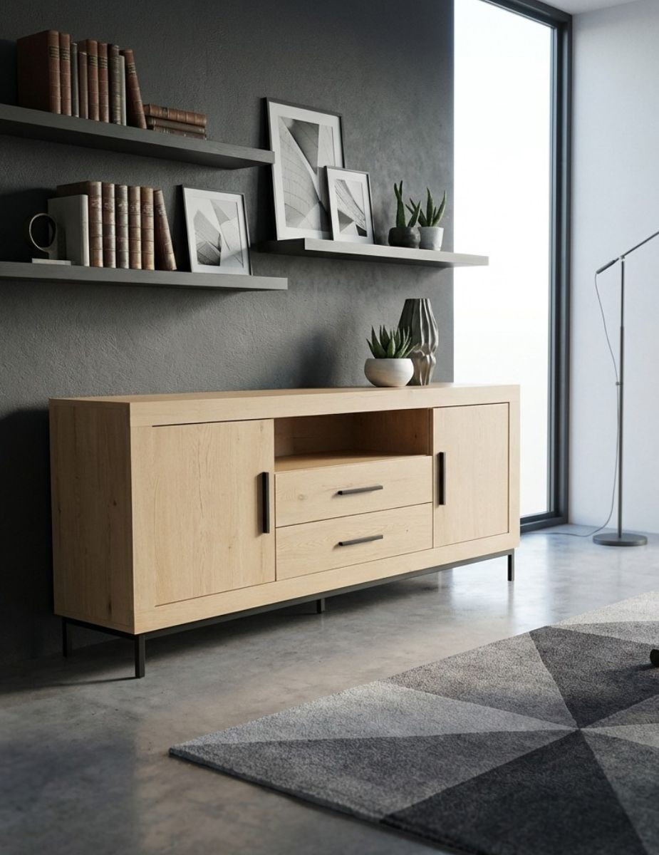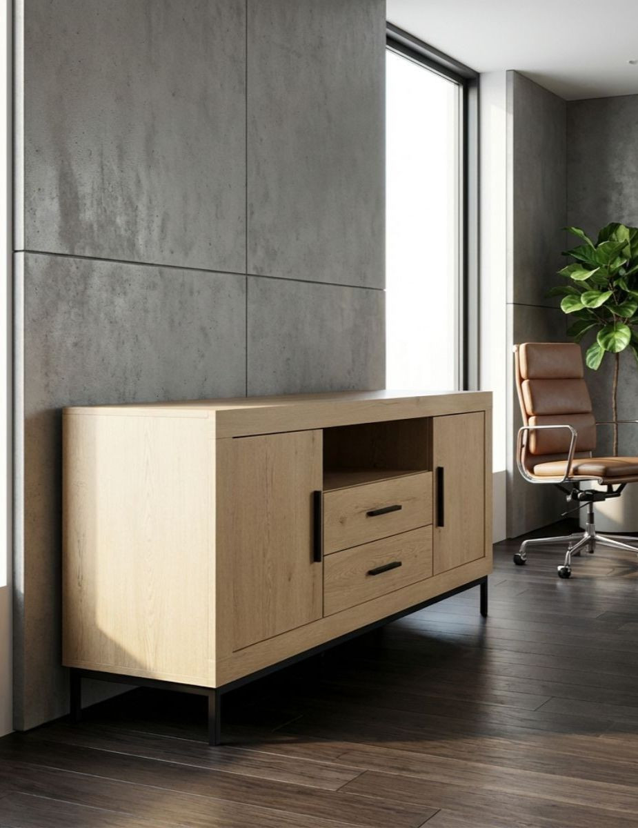 Este aparador es una solución práctica y moderna para oficinas y hogares, combinando diseño, almacenamiento y versatilidad. Presenta dimensiones totales de 68,5 × 180 × 40 cm, ofreciendo una gran capacidad sin ocupar demasiado espacio. Su estructura de melamina, disponible en acabado roble o alpin, aporta un estilo cálido y contemporáneo.