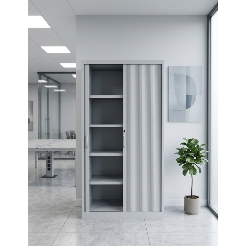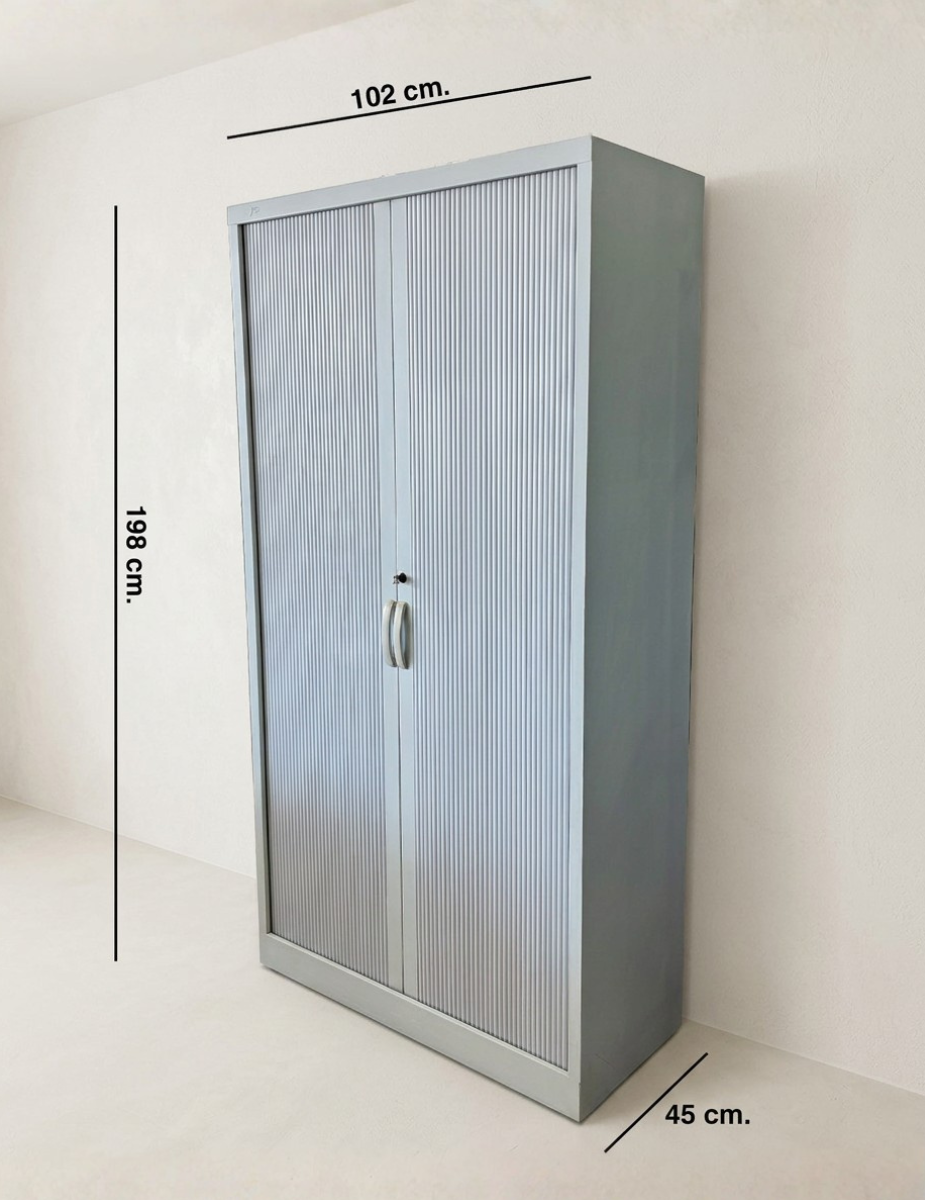 Su estructura metálica en acabado gris garantiza resistencia y durabilidad en el uso diario. Incorpora puertas persiana también en acabado gris, que optimizan el espacio al no requerir apertura frontal adicional.