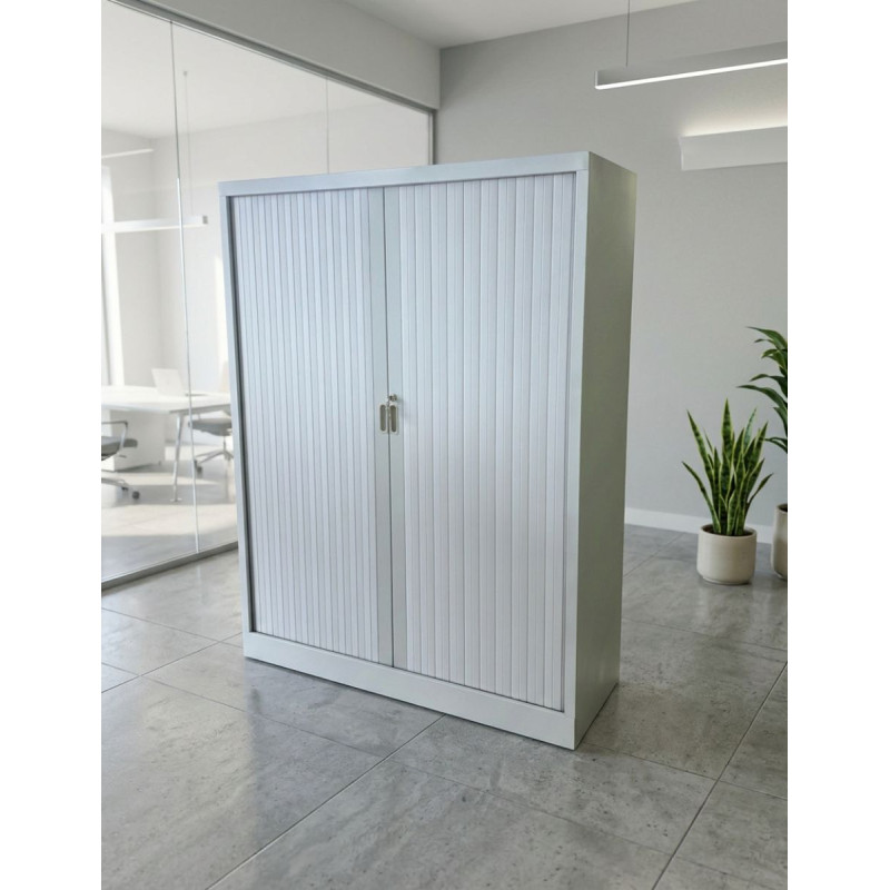 Fabricado con estructura metálica en acabado gris, incorpora puertas persiana del mismo tono, ideales para optimizar el espacio sin interferir en zonas de paso. Los tiradores embutidos mantienen una línea limpia y profesional, reforzando su estética sobria y corporativa.