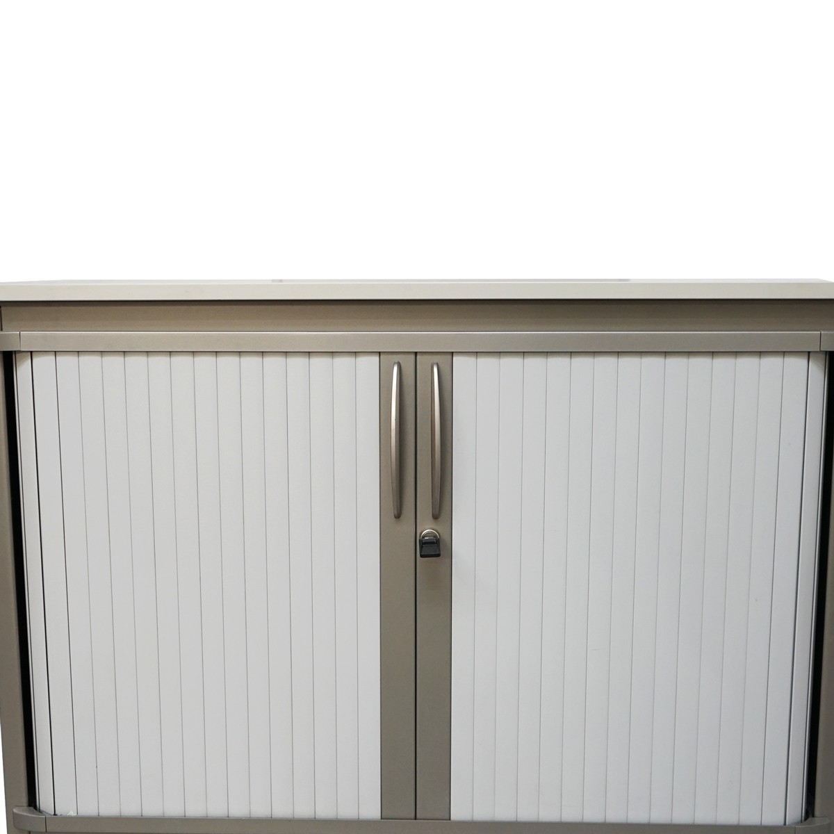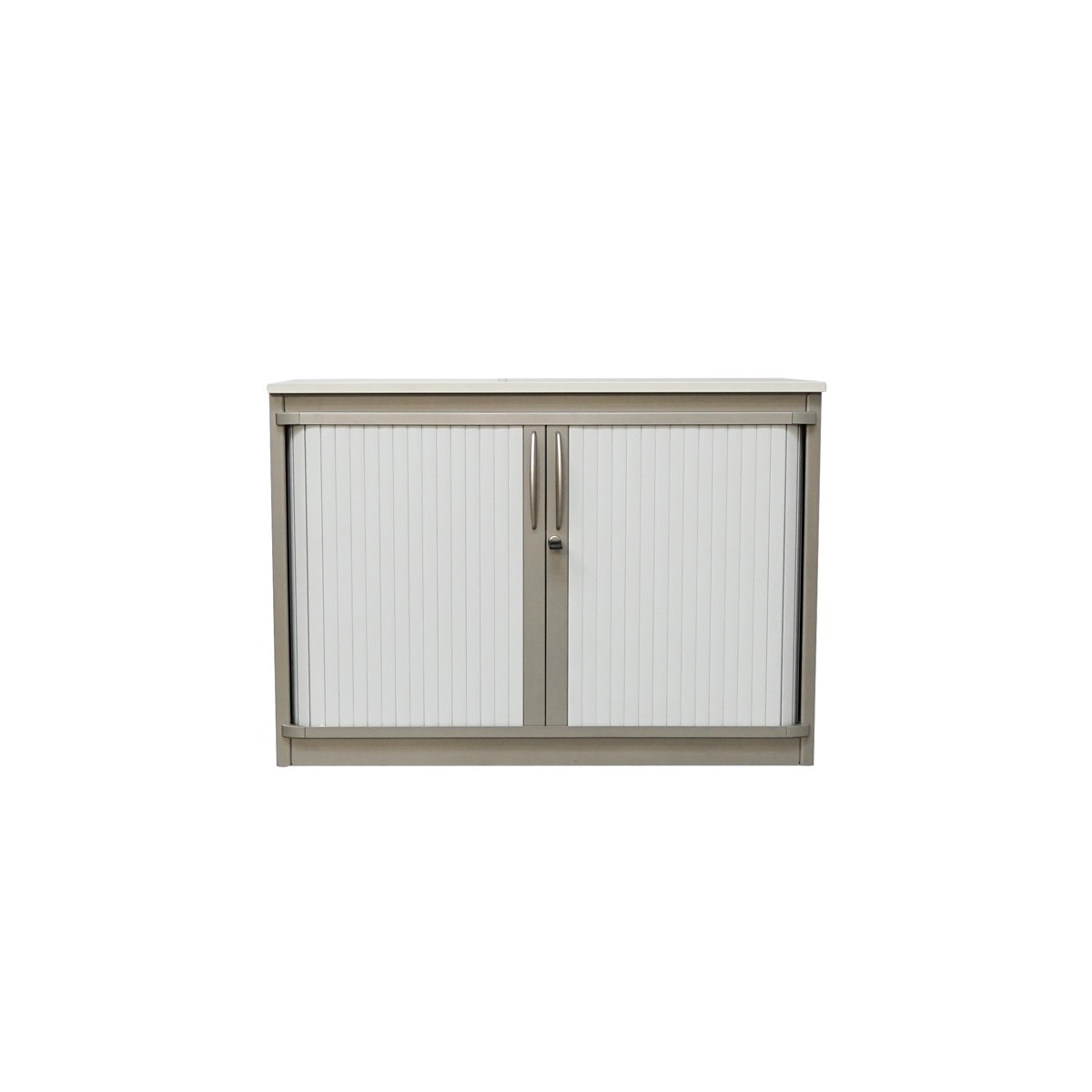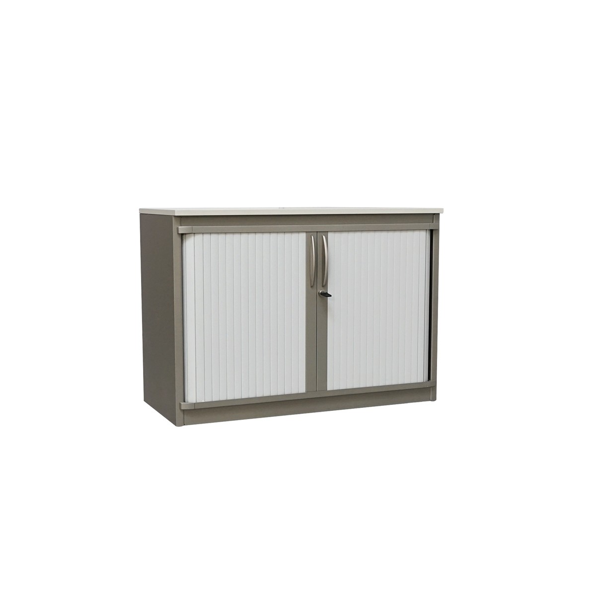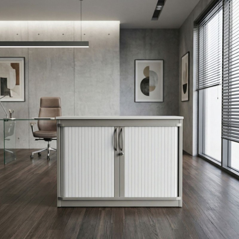 Armario bajo de almacenamiento diseñado para ofrecer funcionalidad y orden en oficinas, despachos y espacios profesionales. Su estructura metálica en acabado gris garantiza resistencia y durabilidad, mientras que la tapa superior de melamina en acabado blanco aporta un contraste moderno y limpio.