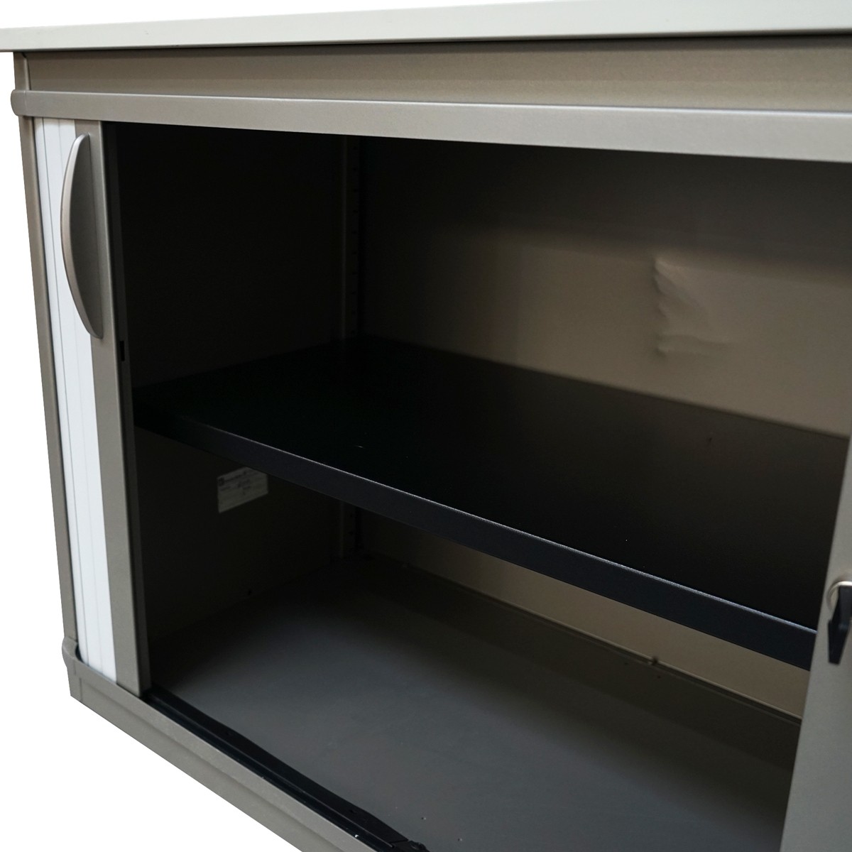 Está equipado con puertas persiana, una solución ideal para ahorrar espacio en zonas de paso, permitiendo abrir y cerrar sin necesidad de volumen adicional. En el interior, incluye 1 leja metálica negra regulable en altura, que permite adaptar el espacio a diferentes tipos de archivadores, carpetas o material de oficina.