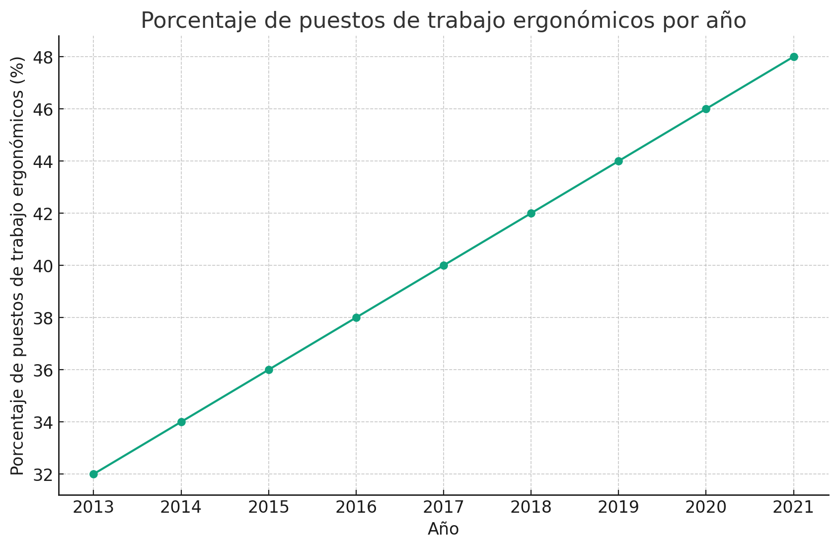 Observando los datos, se nota un ascenso progresivo en la prevalencia de empleos ergonómicos en España durante la última década. A partir de un modesto 32% en 2013, el índice ha crecido hasta alcanzar el 48% en 2021. Diversos factores han impulsado este cambio, incluyendo una mayor conciencia sobre el valor de la ergonomía, regulaciones más estrictas en salud y seguridad ocupacional, y un incremento en los costos relacionados con incidentes laborales.