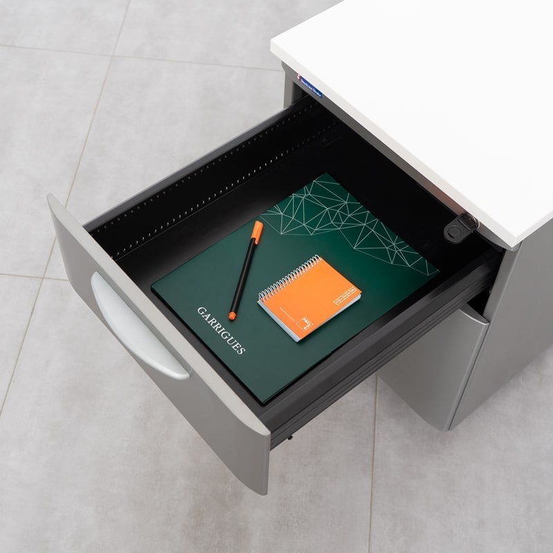 Garantiza la seguridad de tus documentos resguardados y protegidos por la cerradura propia. Sus guías negras aportan diseño pero también facilitan la movilidad y el acceso a los materiales de su interior. Su tapa de madera con acabado blanco supone un toque naturalista y formal a la oficina o despacho. Su quinta rueda permite que la cajonera no vuelque y facilita abrir el cajón-archivo.