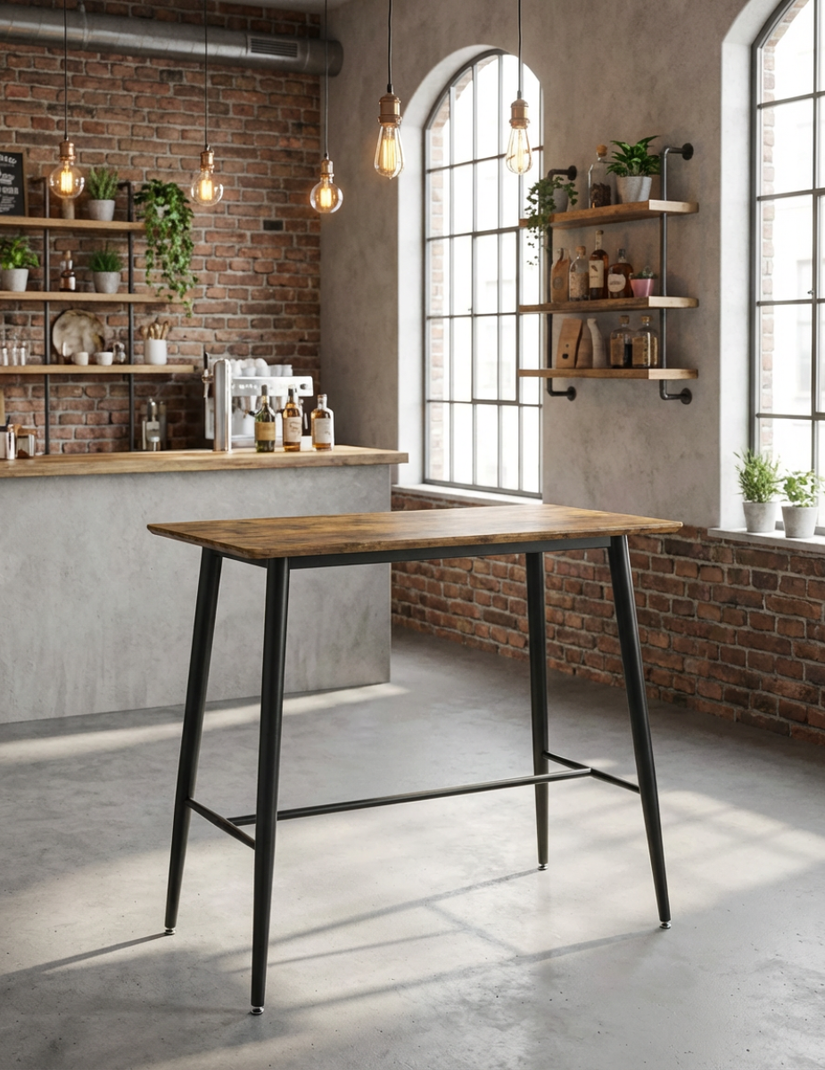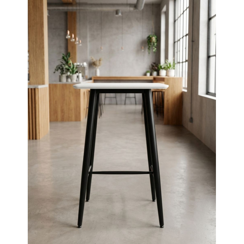 El conjunto se completa con un tablero de melamina en acabado blanco, que aporta luminosidad, contraste y una superficie fácil de limpiar y mantener. Gracias a su diseño versátil, esta mesa alta se adapta perfectamente a diferentes entornos, ofreciendo una solución práctica y estética para el día a día.