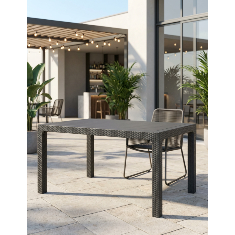 La Mesa Antracita Terraza Tropical de Grupo SDM es una opción perfecta para quienes buscan resistencia, diseño y versatilidad en espacios exteriores e interiores. Su acabado en color antracita y su elegante textura efecto ratán aportan una estética moderna y acogedora, ideal para terrazas, jardines y zonas de uso intensivo.