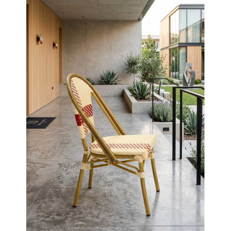 La Silla Hostelería Ratán Garnier de Grupo SDM es una opción ideal para quienes buscan estilo, resistencia y diseño elegante en espacios profesionales. Su combinación de acabados en bambú y ratán sintético en tonos beige y rojo aporta una estética cálida y distintiva, perfecta para ambientes que buscan personalidad.