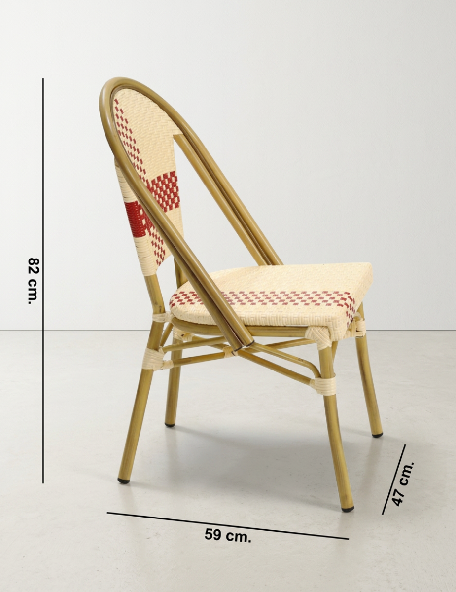 Asiento y respaldo tapizado en ratán sintético con acabado en beige y rojo