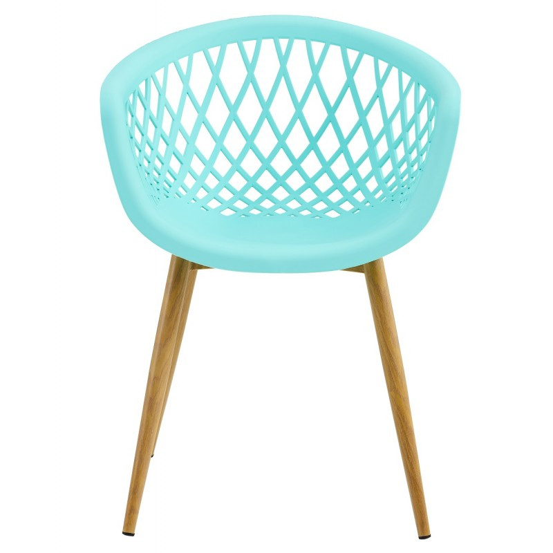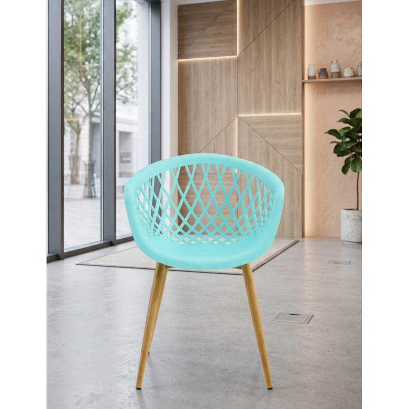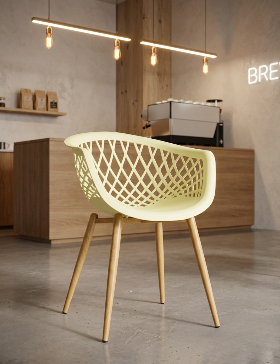Cuenta con una base metálica de 4 patas con acabado imitación madera, que garantiza estabilidad, durabilidad y un toque cálido al conjunto. El asiento y respaldo de polipropileno ofrecen una sentada cómoda, ligera y fácil de mantener, ideal para un uso continuado.