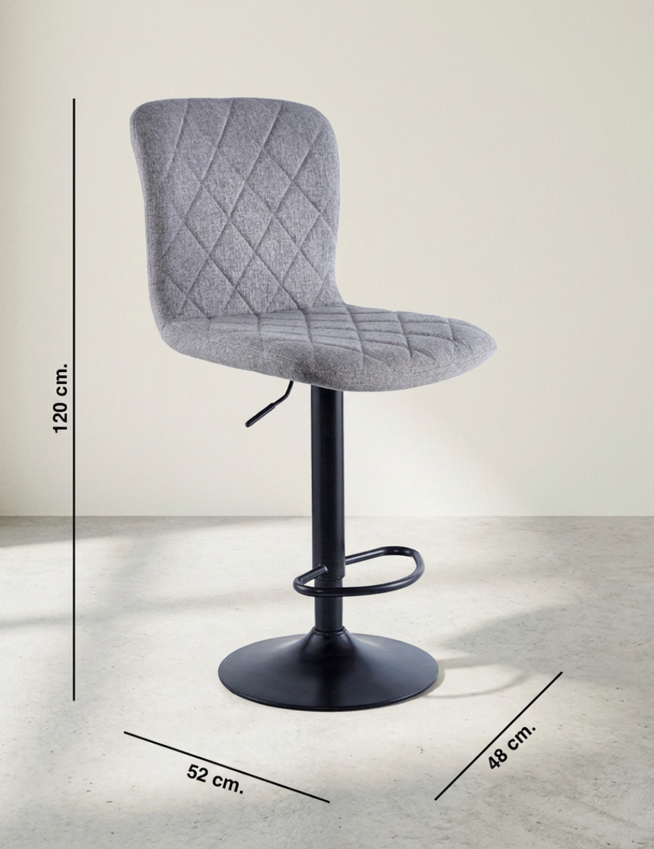 Cuenta con una estructura metálica en acabado negro, que garantiza estabilidad y resistencia en el uso diario. El asiento y respaldo tapizados en tela gris ofrecen una sentada cómoda y acogedora, ideal para un mayor confort. Además, incorpora apoyapiés, mejorando la ergonomía durante su uso.