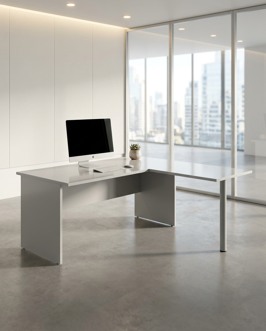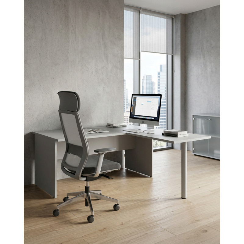 Dispone de un ala lateral de 72 x 60 x 70 cm, que amplía la zona de trabajo y mejora la funcionalidad. Fabricada íntegramente en melamina de acabado personalizable, está disponible en blanco, haya, roble o gris, garantizando uniformidad en la mesa, el faldón, las patas panel y el ala.