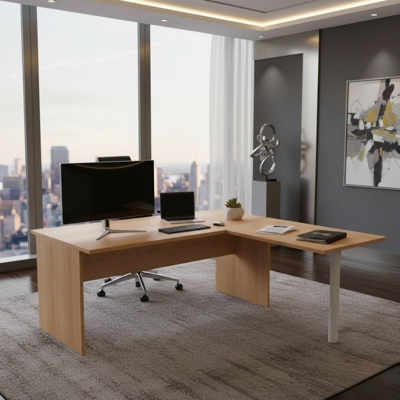 La mesa de oficina con ala modelo Pompeya de Artexport destaca por su diseño práctico y versátil, ideal para crear espacios de trabajo amplios y organizados. Sus dimensiones son de 72 cm de alto, 140 cm de ancho y 150 cm de fondo, con opción también en 160 x 150 cm para quienes necesitan mayor superficie.