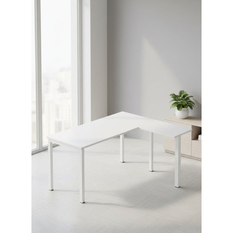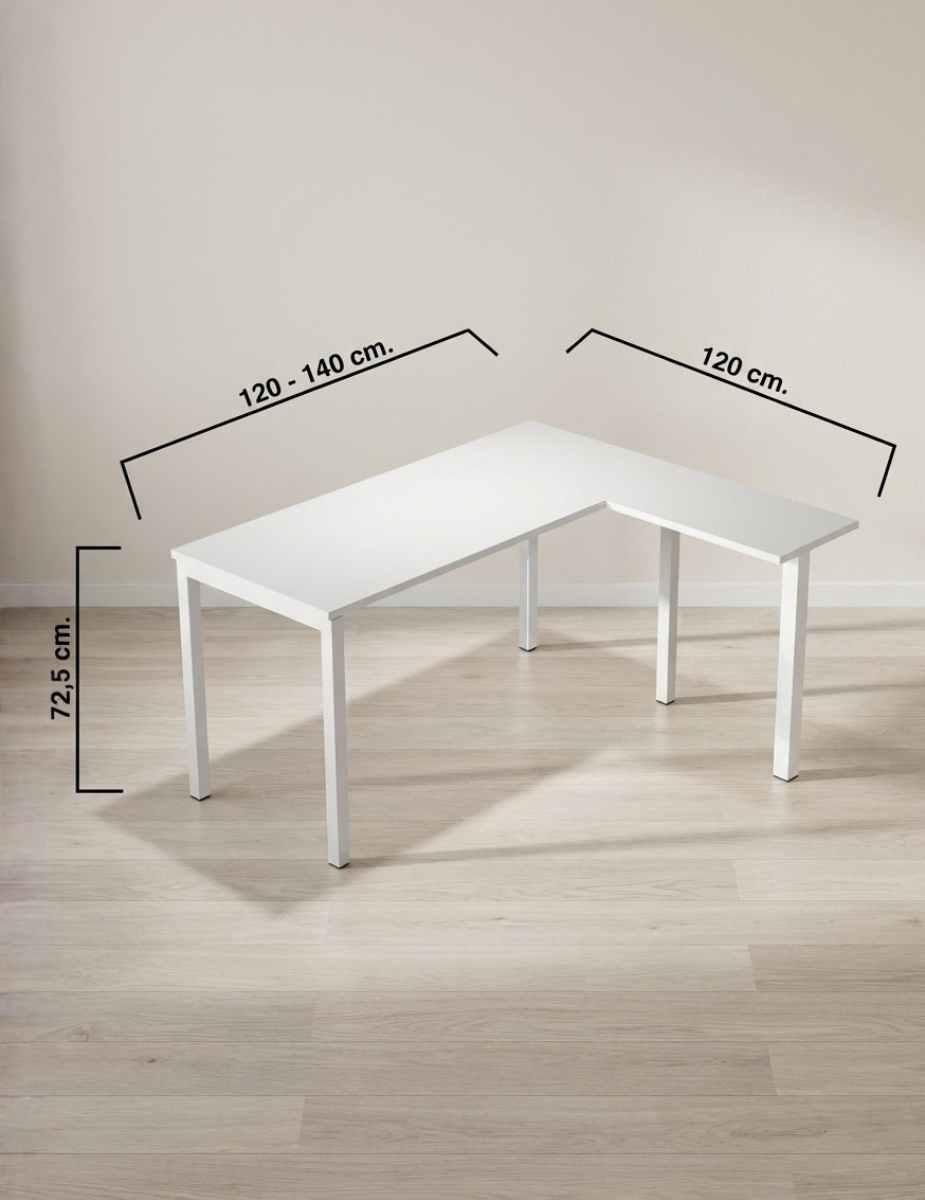 Dispone de un ala auxiliar de 72,5 x 35 x 60 cm en melamina blanca, que amplía la superficie de trabajo y facilita la organización del puesto. El tablero principal en melamina blanca aporta un estilo limpio y elegante, mientras que sus 4 patas metálicas de acabado blanco garantizan estabilidad y durabilidad.