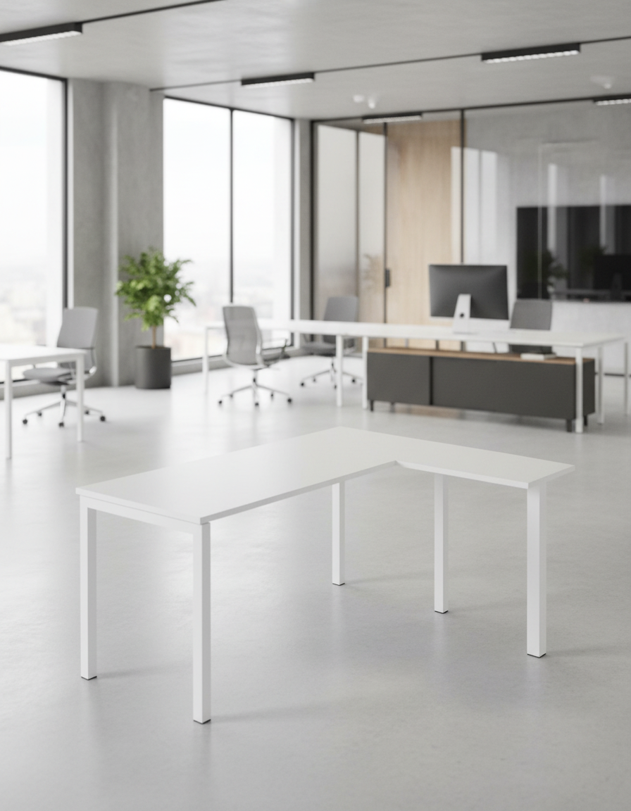 La mesa de oficina con ala modelo Atrani de Artexport ofrece un diseño práctico y luminoso, ideal para espacios modernos de trabajo o estudio. Con unas dimensiones de 72,5 cm de alto, 120 cm de ancho y 120 cm de fondo, también está disponible en formato de 140 x 120 cm, adaptándose a distintas necesidades de espacio.