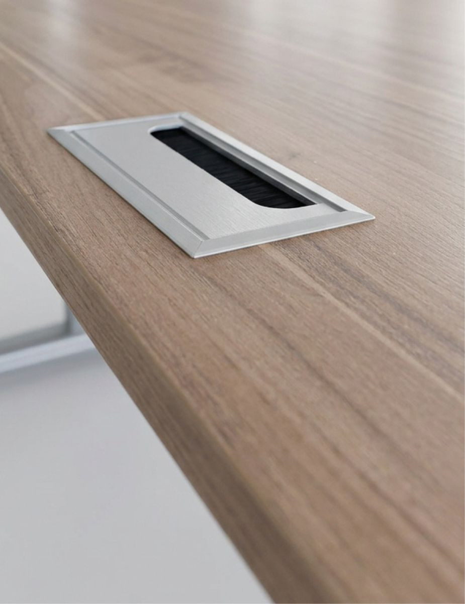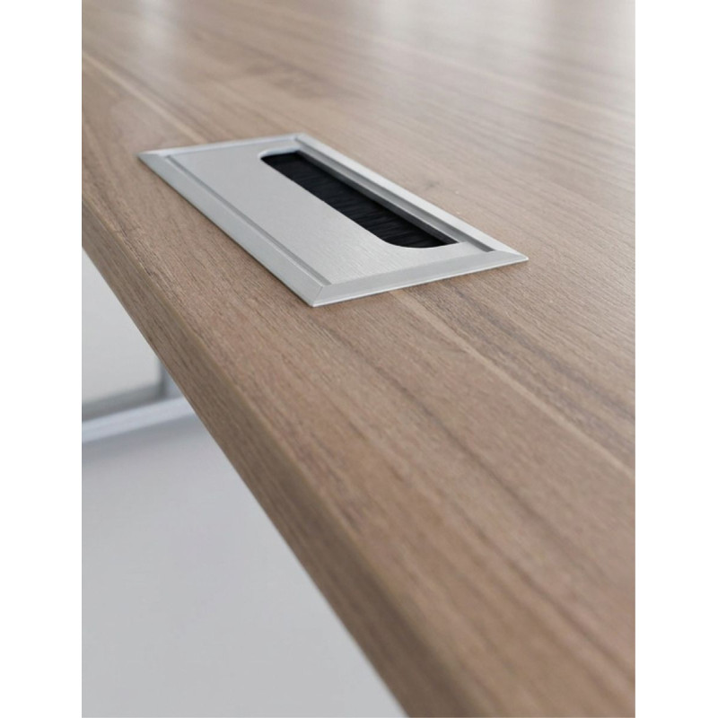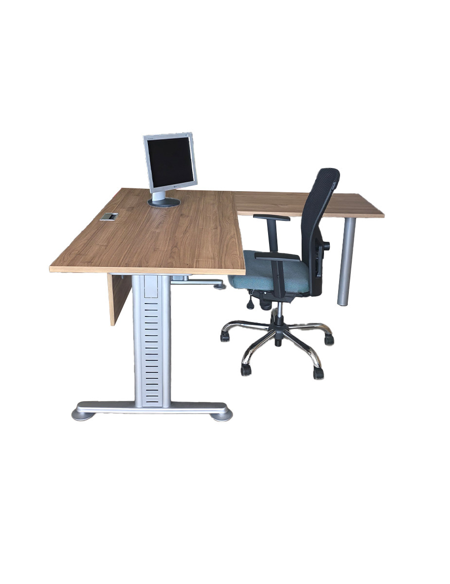 La mesa principal mide 160x80 cm, mientras que el ala (60x90 cm) amplía la superficie útil para documentación, equipos auxiliares o zona de apoyo. Tanto el tablero como el ala están fabricados en melamina acabado nogal slow, aportando calidez y una estética elegante que encaja en despachos ejecutivos y entornos corporativos.
