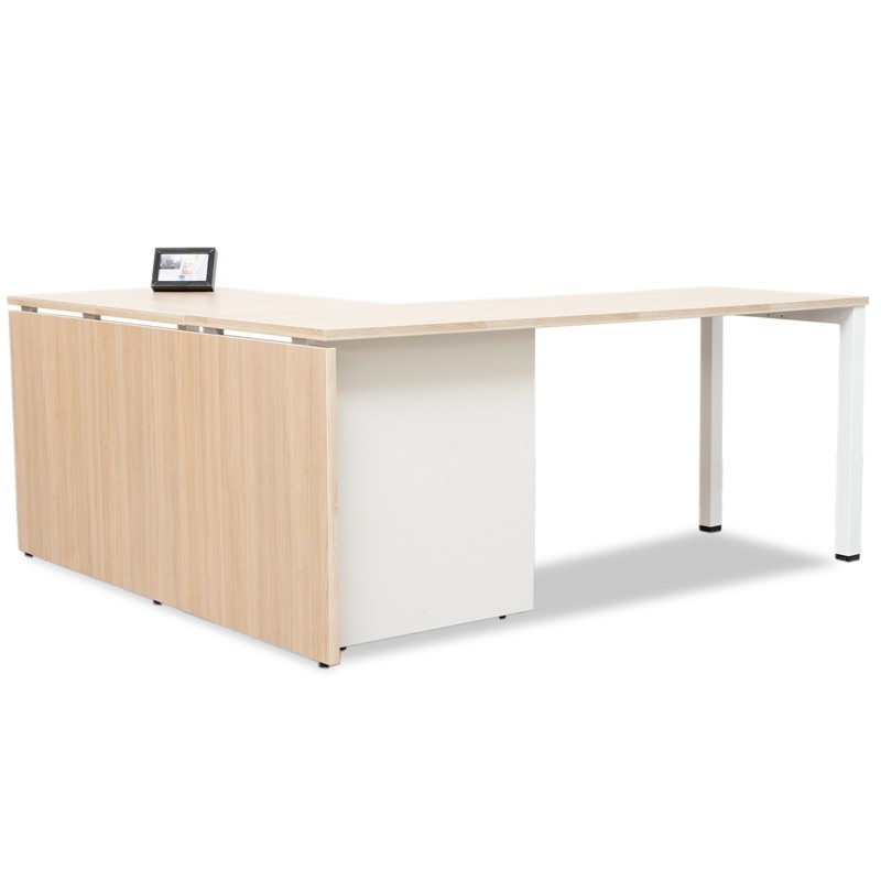 Respecto al ala, será en el mismo acabado que elija para el tablero principal y como soporte final, se puede elegir una cajonera pedestal con 4 cajones y un plumier o una cajonera pedestal con 2 cajones, 1 archivo y un plumier. En ambos casos, el plumier lleva cerradura con la que se cierran todos los cajones. Si prefieres la mesa sin cajonera, se servirá con un pie individual.