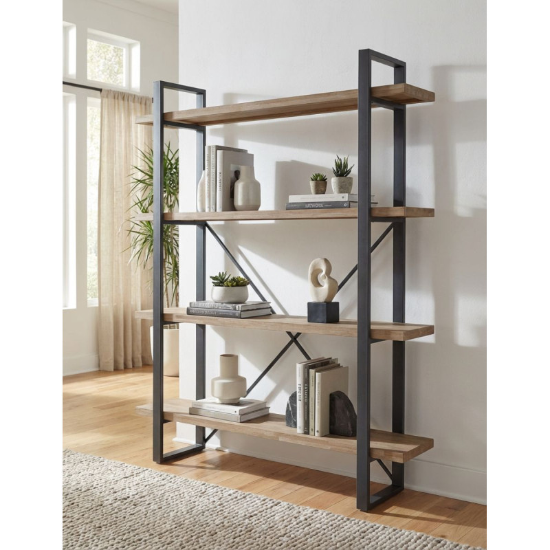 Cuenta con 4 estantes en madera de roble, disponibles en acabado Nordish o American, que aportan calidez natural y presencia sólida. La estructura metálica en acabado negro refuerza su estabilidad y aporta un estilo industrial contemporáneo que combina resistencia y diseño.