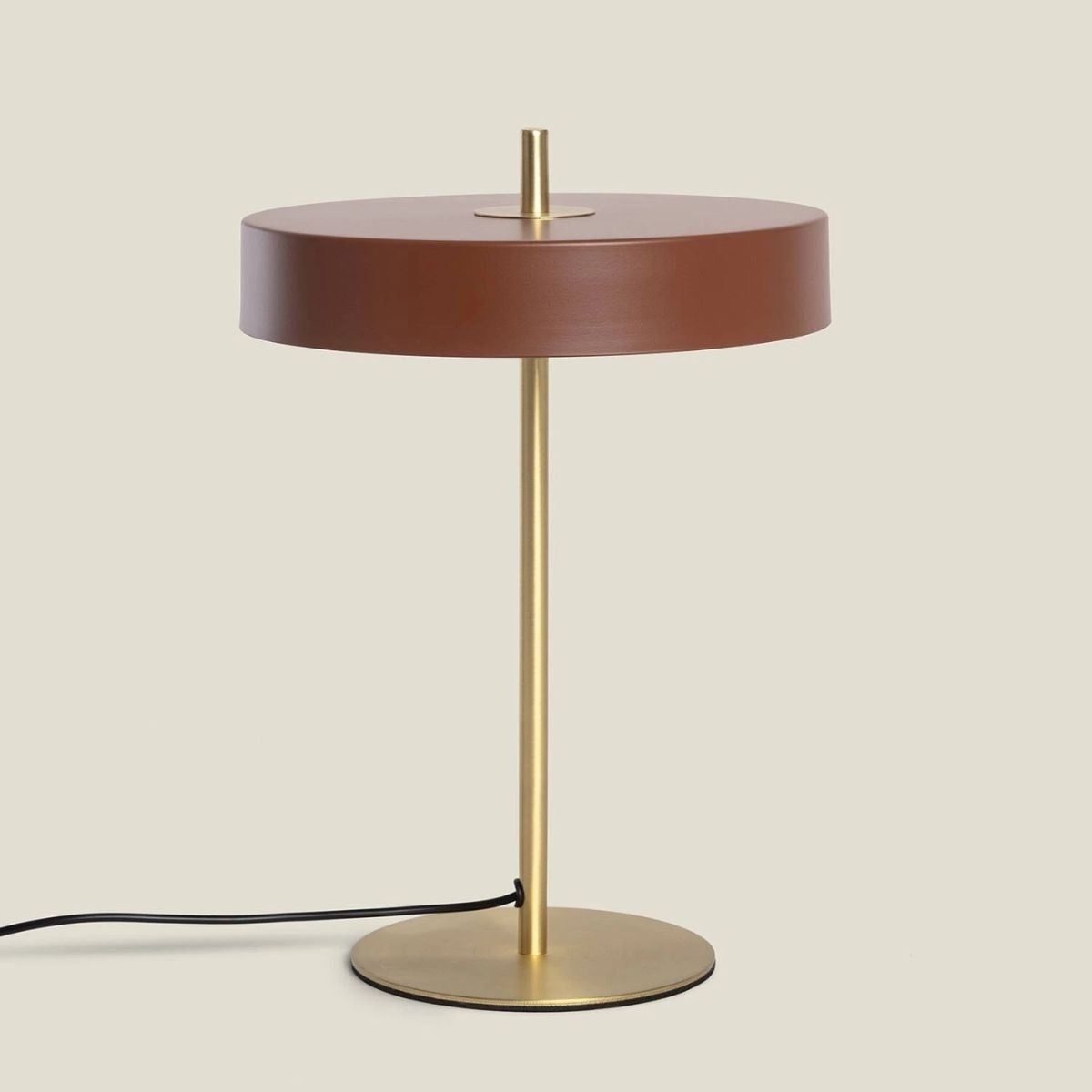 Con un diseño compacto de Ø22 × 35 cm, combina una estructura metálica en tono dorado con una pantalla de acabado marrón, creando una estética sofisticada y cálida que aporta personalidad al espacio. Su formato la hace perfecta para escritorios, aparadores o mesillas sin ocupar demasiado espacio.