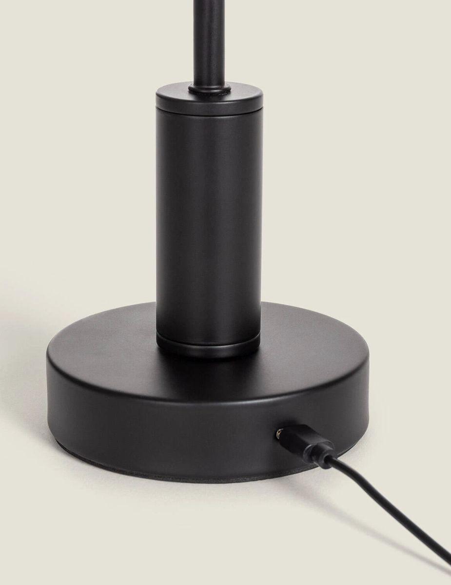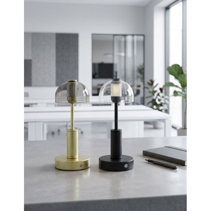 Fabricada con estructura metálica disponible en acabado negro o dorado, encaja tanto en ambientes modernos como en espacios más sofisticados. Incorpora batería USB recargable, lo que permite utilizarla sin necesidad de conexión constante a la red, facilitando su movilidad y versatilidad.