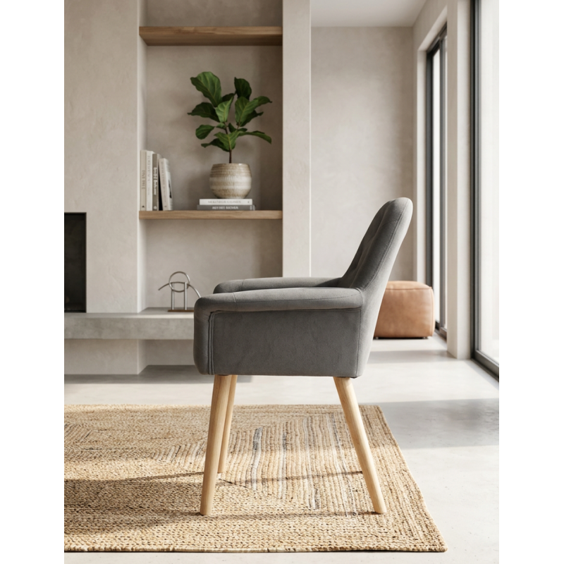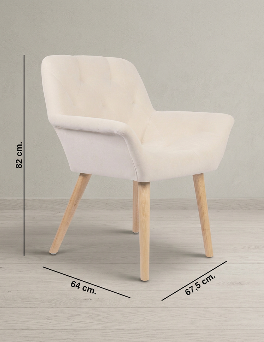 Cuenta con asiento y respaldo tapizados en microfibra, disponibles en gris o beige, ofreciendo una sentada cómoda, agradable al tacto y perfecta para el uso diario. Sus patas de melamina en acabado natural aportan estabilidad y un toque cálido que encaja fácilmente en diferentes estilos decorativos.