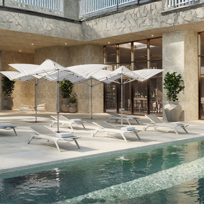 Fabricada en polipropileno reforzado con fibra de vidrio mediante inyección de gas, ofrece una estructura ligera pero extremadamente resistente a la intemperie, ideal para terrazas, jardines, piscinas o zonas lounge.