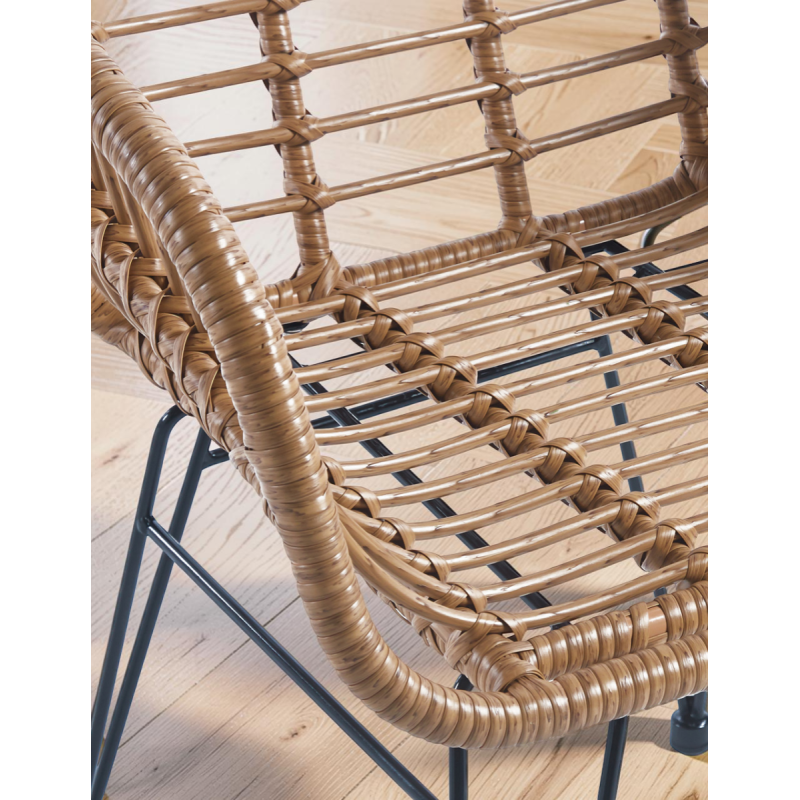 Cuenta con una estructura metálica en acabado negro y base de 4 patas, que garantizan estabilidad, durabilidad y un uso fiable en el día a día. El asiento y respaldo de ratán PE ofrecen una sentada cómoda y ligera, además de un diseño atractivo que encaja tanto en interiores como en exteriores.