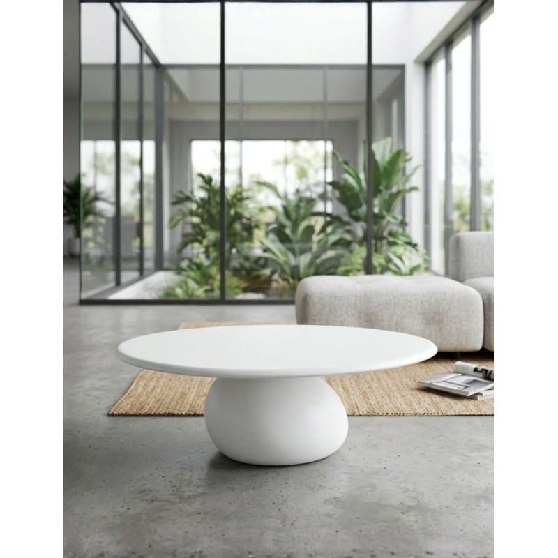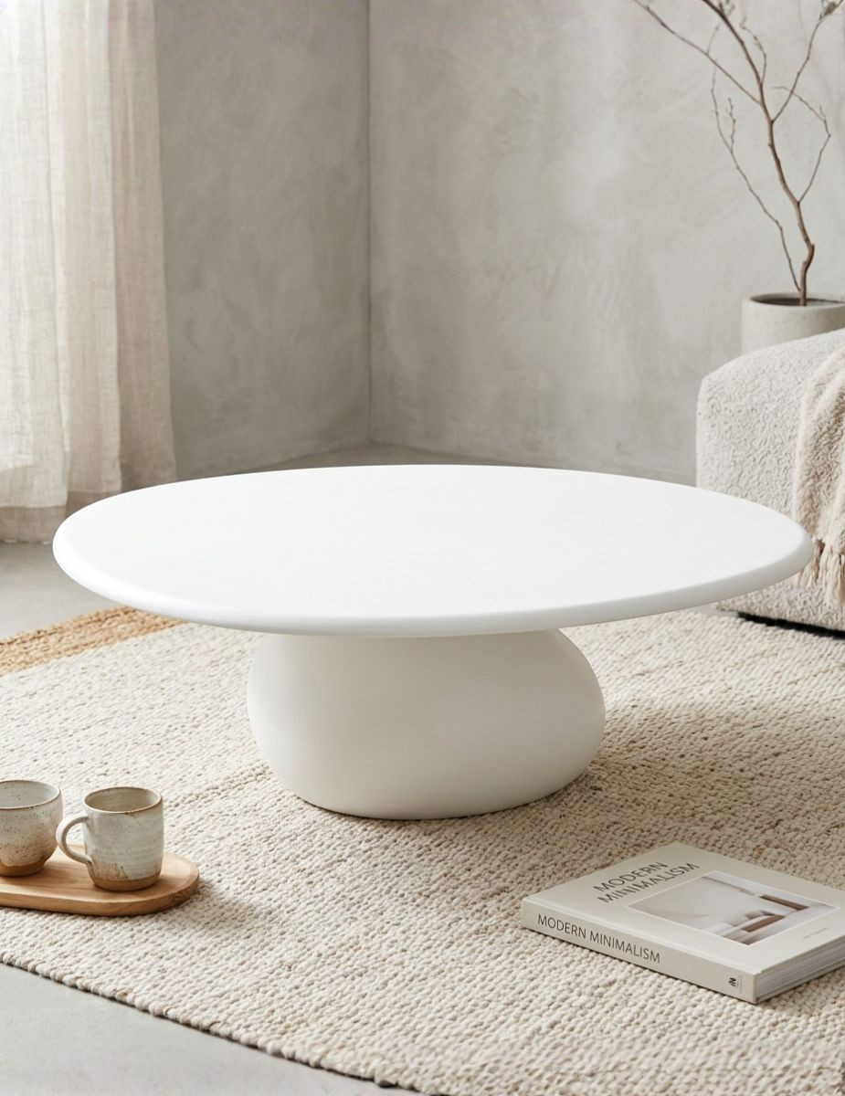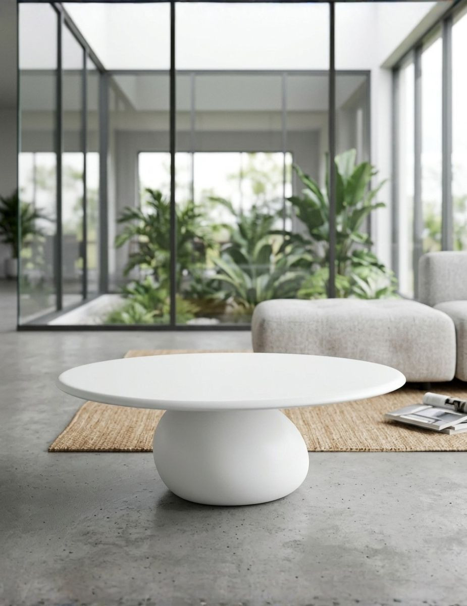El contraste entre la textura pétrea de la base y la pureza del tablero genera una composición refinada y atemporal, propia del diseño de autor.