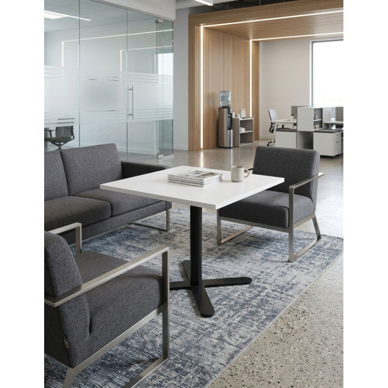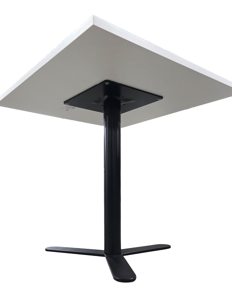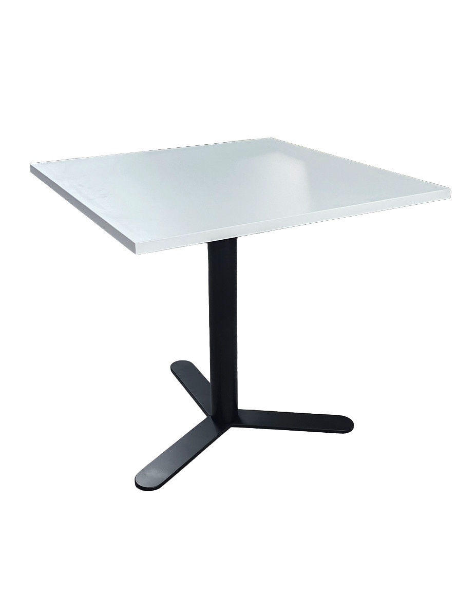 Su tablero cuadrado de melamina en acabado blanco aporta luminosidad y un estilo limpio que encaja fácilmente en entornos modernos. Se apoya sobre una peana metálica en acabado negro, que proporciona estabilidad y contraste visual elegante.