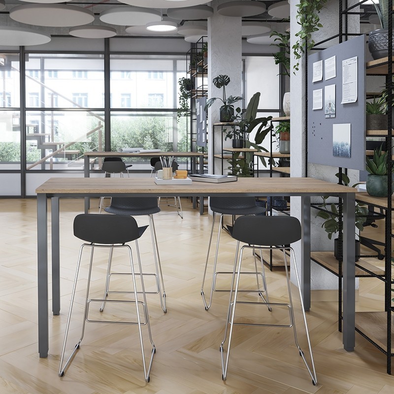 Gracias a su altura elevada, esta mesa fomenta la interacción y la comunicación, convirtiéndose en un elemento clave para espacios de trabajo dinámicos y zonas de encuentro.