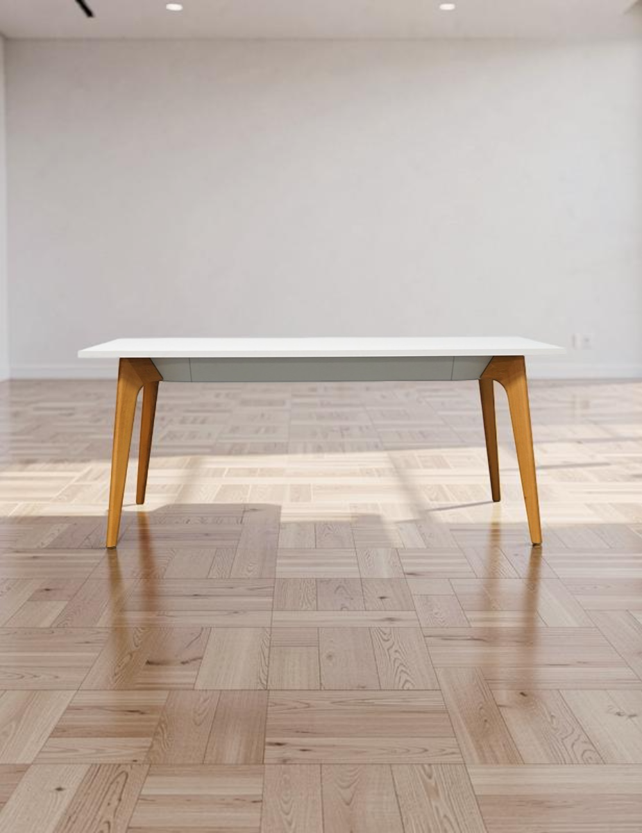 La mesa se sostiene sobre una base con 4 patas de madera en acabado haya, que no solo aportan estabilidad y durabilidad, sino también un toque cálido y natural al diseño, creando un equilibrio visual entre lo moderno y lo cálido.