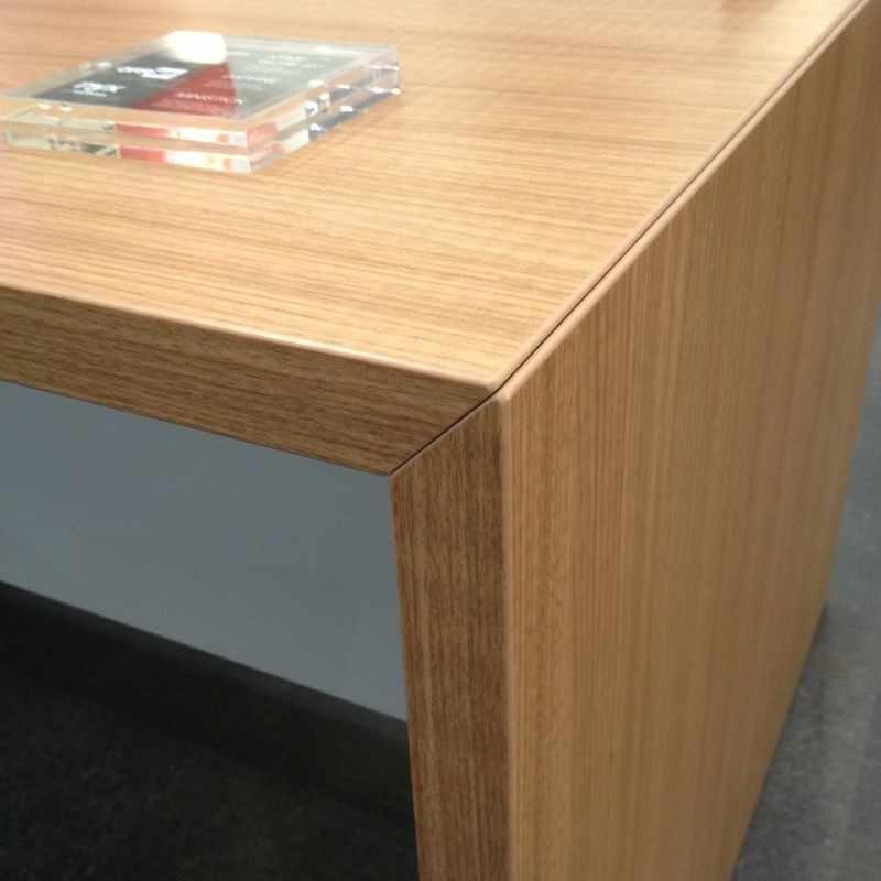 Disponible en acabados de eucalipto, olmo y nogal canaletto para la mesa, y en blanco, eucalipto, olmo o nogal canaletto para el ala, permite personalizar el conjunto según el estilo y entorno de trabajo.
