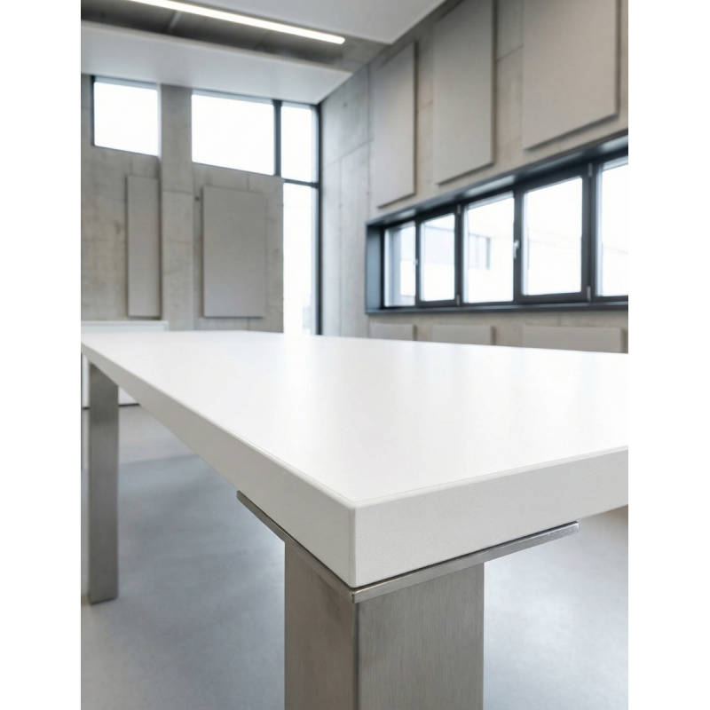 La mesa se apoya sobre cuatro patas metálicas con acabado platino, que aportan una imagen moderna y garantizan una excelente estabilidad. Bajo el tablero, las dos vigas longitudinales metálicas refuerzan la estructura y evitan cualquier posible arqueo con el paso del tiempo.