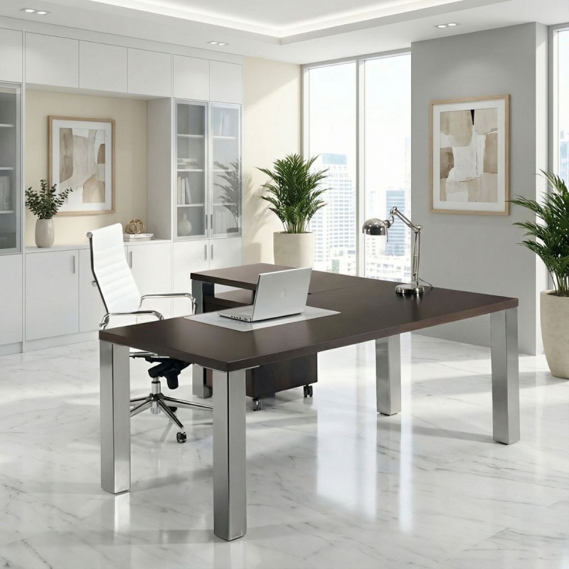 Disponible en acabado blanco o wengué, esta mesa con ala es una opción pensada para quienes buscan funcionalidad, solidez y una distribución de trabajo eficiente en su oficina.