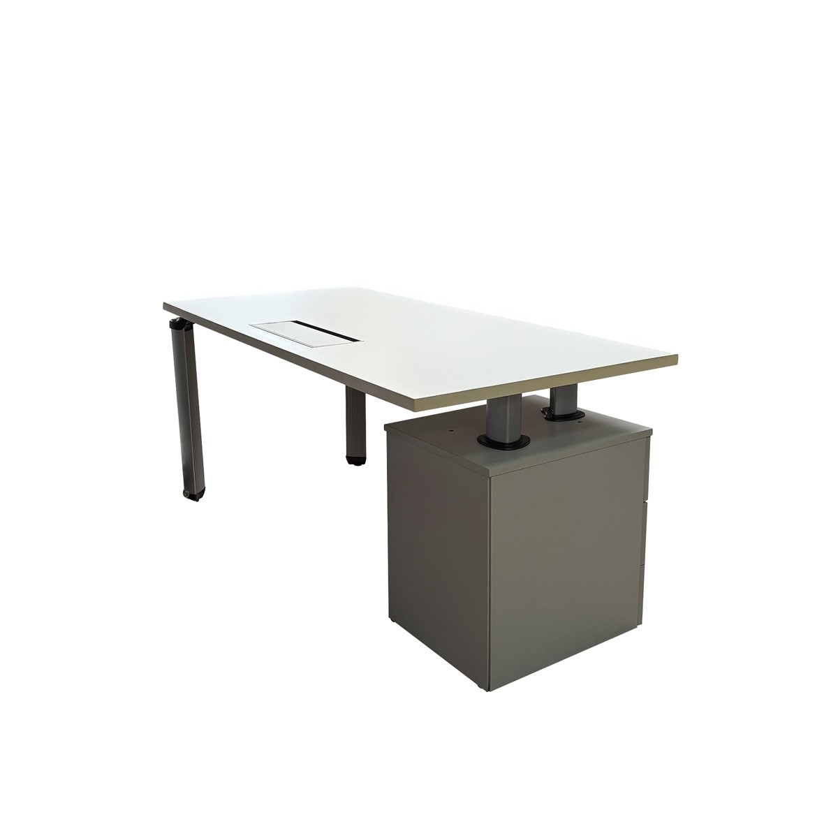 Además, incorpora un pasacables rectangular que ayuda a organizar el cableado y mantener el espacio despejado. Un detalle importante es que la cajonera puede colocarse tanto a la derecha como a la izquierda, permitiendo adaptar el escritorio a la distribución y necesidades de cada usuario.