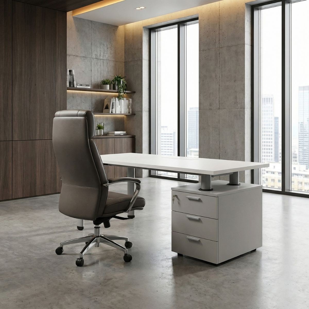La estructura combina patas cilíndricas de acero en color gris con un pedestal metálico de tres cajones, aportando estabilidad y un diseño limpio y profesional. La cajonera, fabricada en melamina gris, incluye 3 cajones con interiores de polipropileno, cierre centralizado y llave para mantener tus pertenencias seguras.
