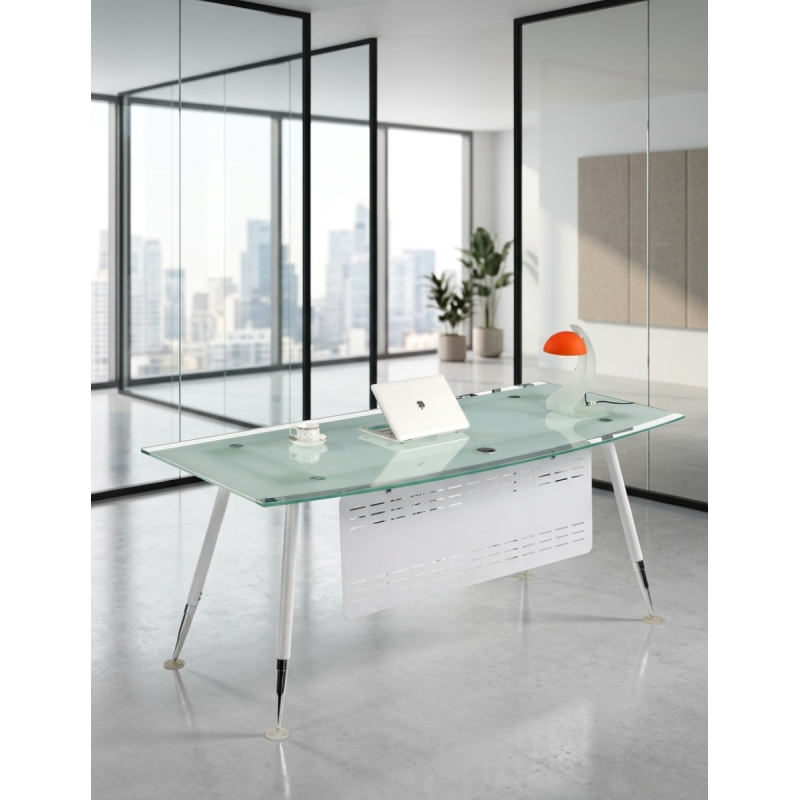 Las patas de aluminio en acabado blanco combinado con cromado añaden estabilidad y un toque sofisticado al conjunto. Se completa con un faldón de chapa de acero perforada en color blanco, que aporta privacidad, resistencia y una imagen profesional. Una mesa de oficina de vidrio ideal para quienes desean unir presencia, calidad y estilo en un mismo mueble.