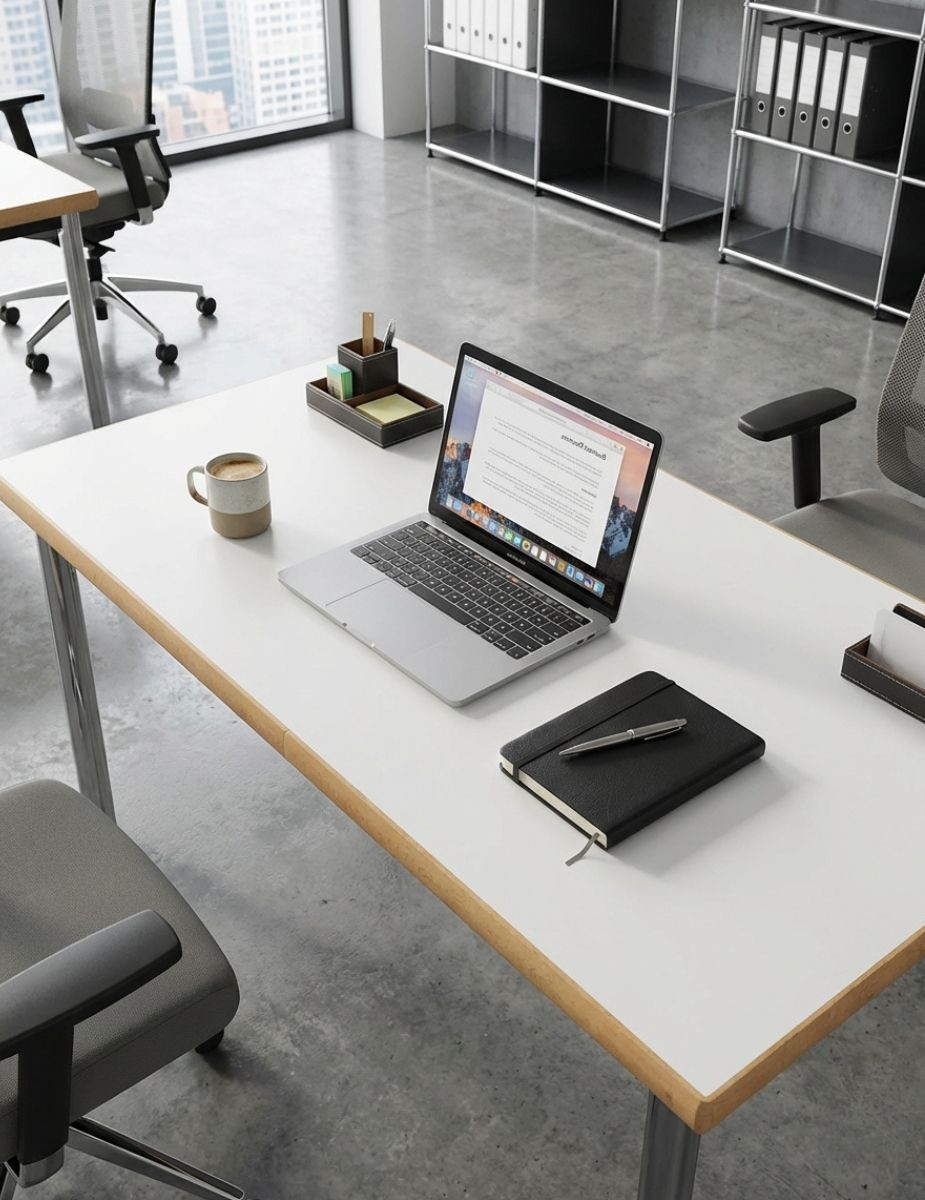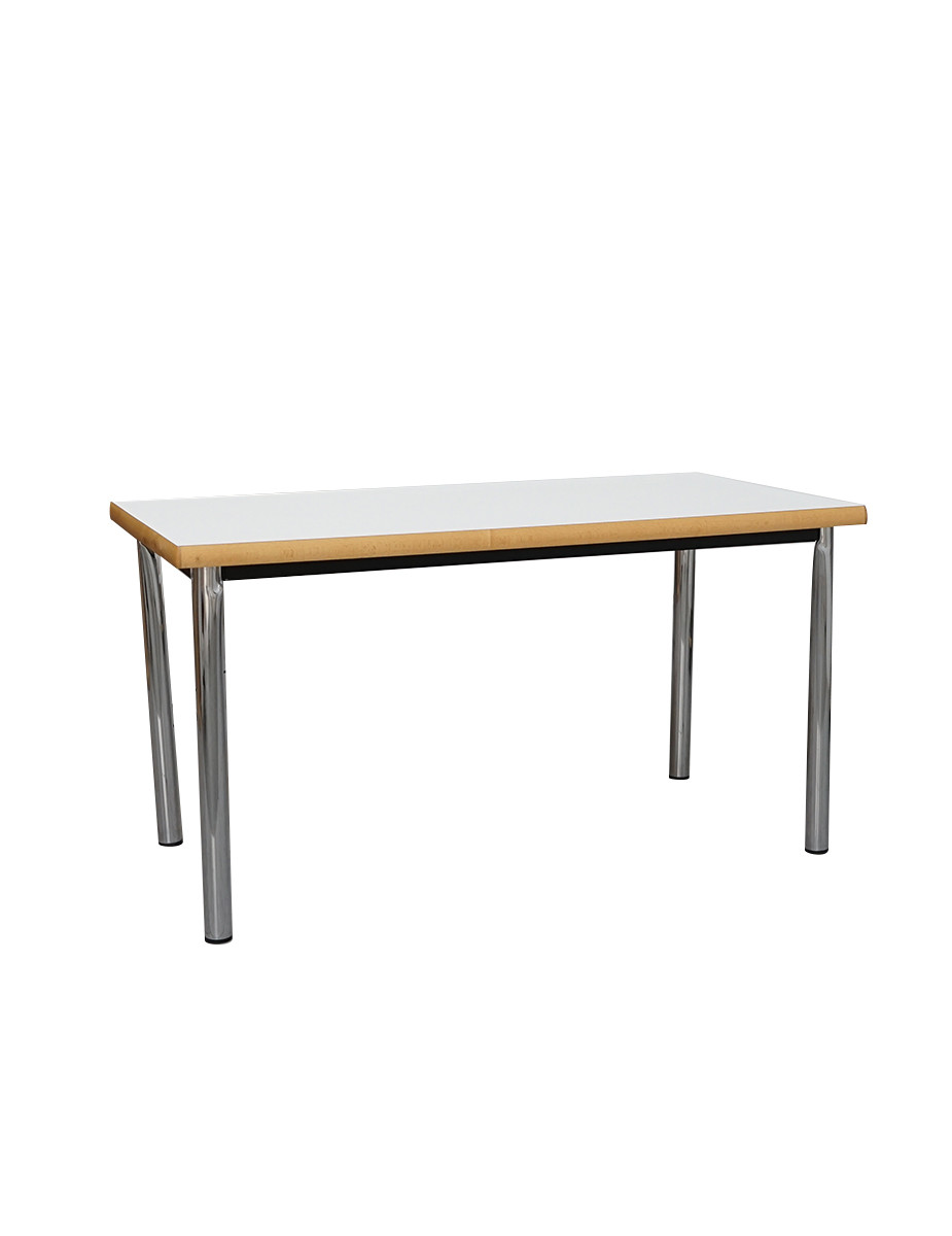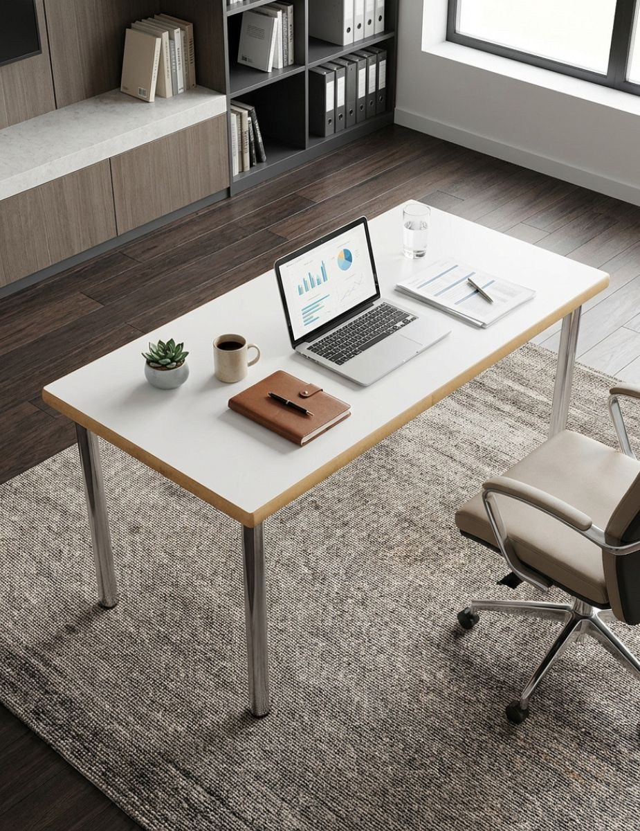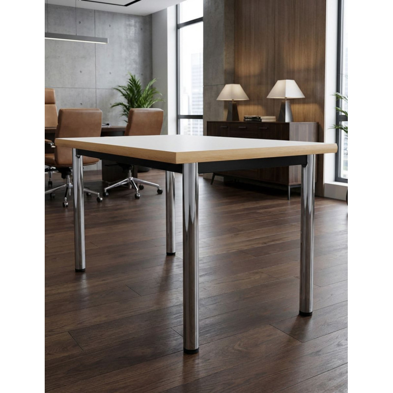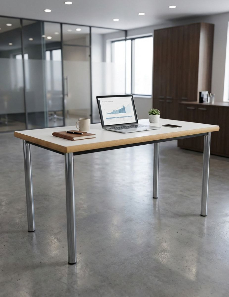 Esta mesa de oficina combina un diseño sencillo y funcional con una estética luminosa y profesional, ideal para despachos, puestos operativos, aulas o espacios de trabajo versátiles. Su estructura incorpora una base de 4 patas tubulares metálicas en acabado cromado, un soporte que aporta estabilidad, resistencia y una imagen ligera de estilo actual.