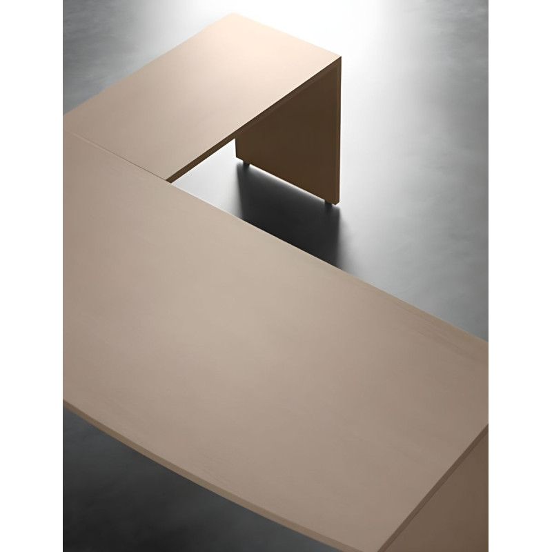 Dispone de un tablero fabricado de melamina de 30 mm de grosor y de acabado personalizable. Incorpora un faldón del mismo material pero de 19 mm de grosor.