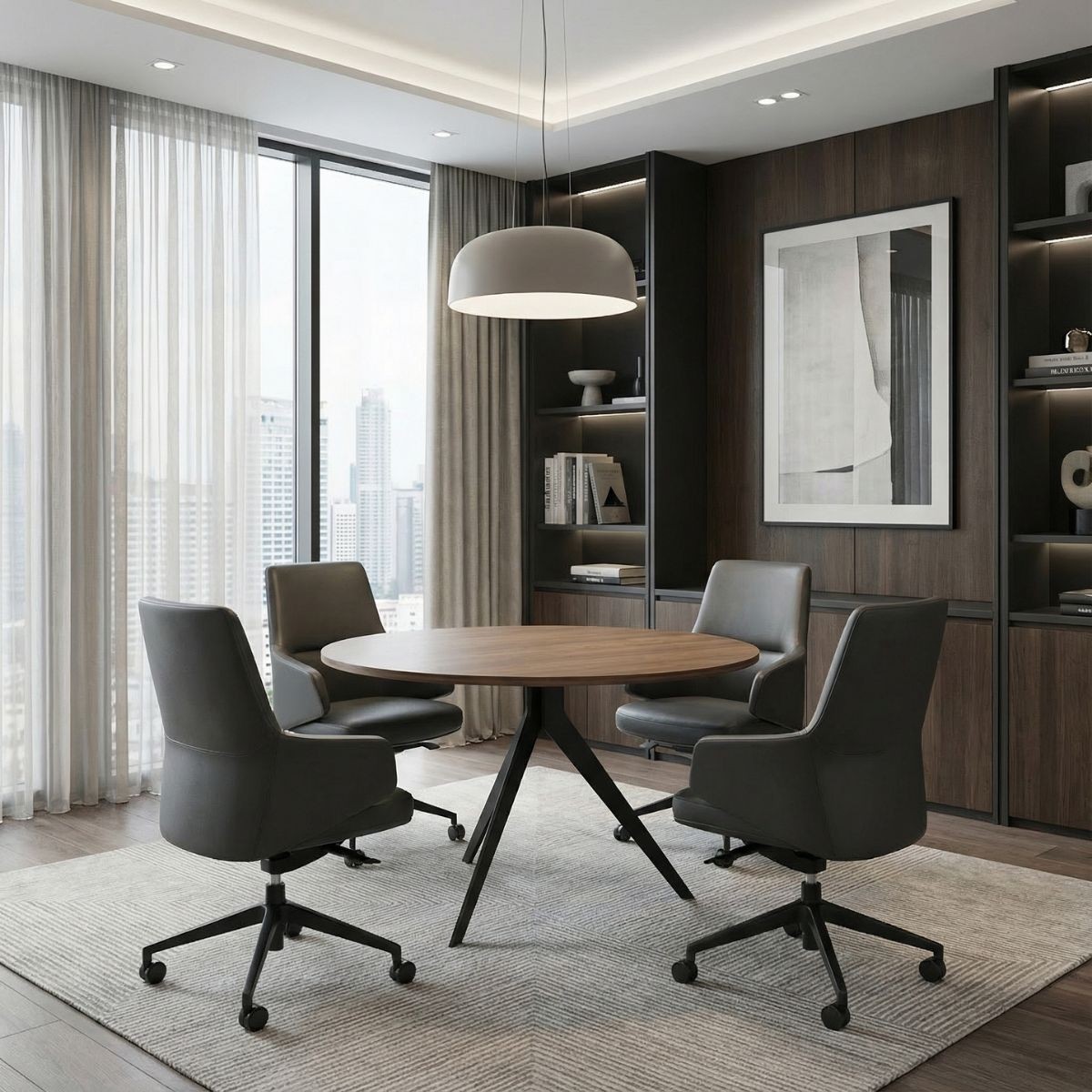 La mesa redonda Orta Ø120 cm en acabado Java de Bogal destaca por su diseño contemporáneo, equilibrio visual y materiales resistentes, ideal para oficinas, salas de reuniones o comedores modernos.