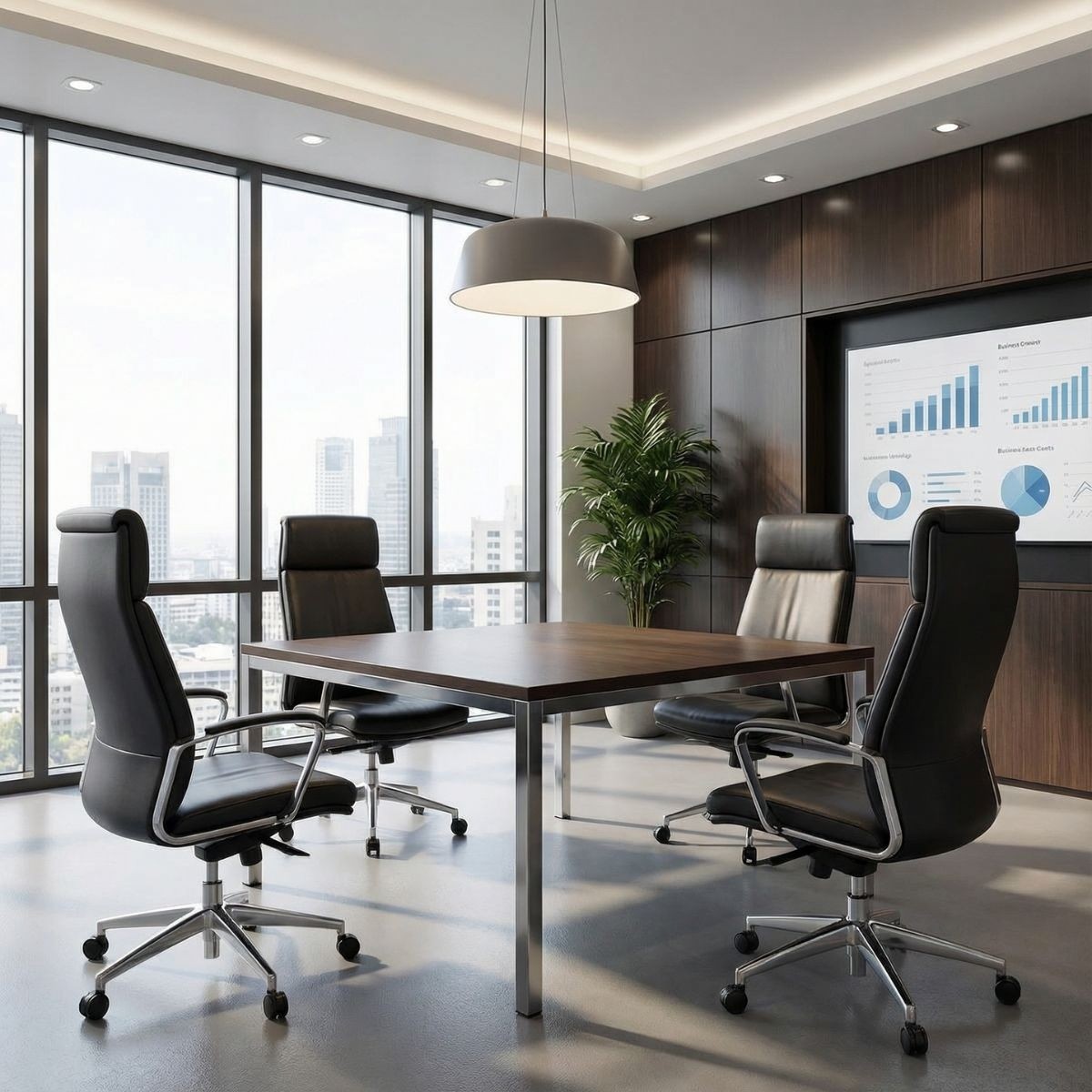 Su estructura incorpora 4 patas metálicas, que garantizan estabilidad y un estilo contemporáneo. El tablero de melamina en acabado nogal aporta calidez y elegancia, integrándose fácilmente en entornos profesionales que buscan un toque distintivo.