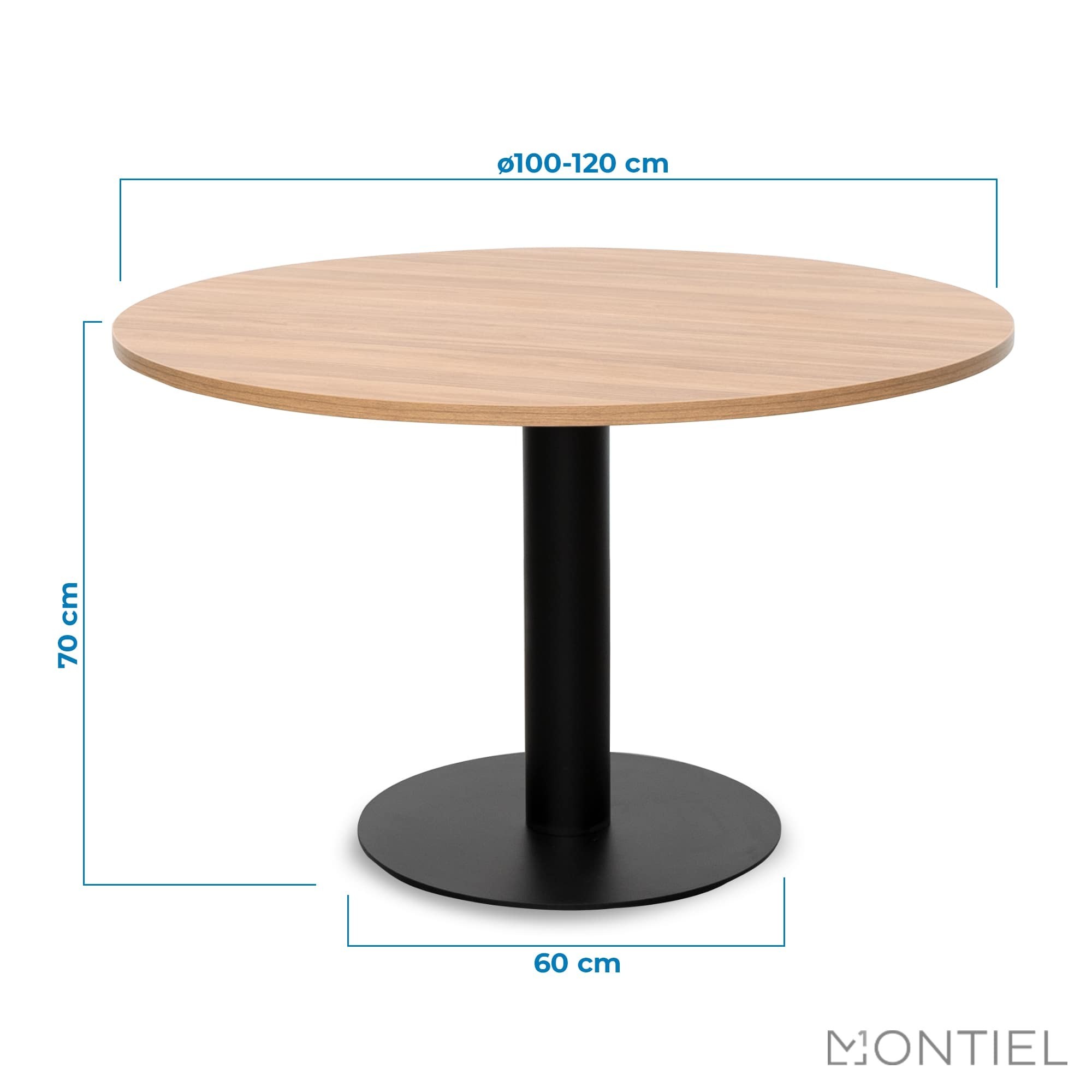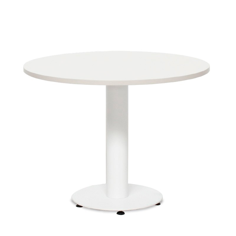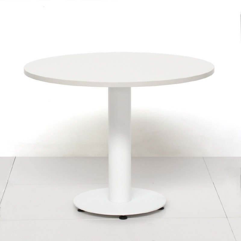 El modelo Meeting de reunión, está fabricado con tablero redondo laminado de 100 o 120 cm de diámetro en color blanco, roble bello o nogal slow.