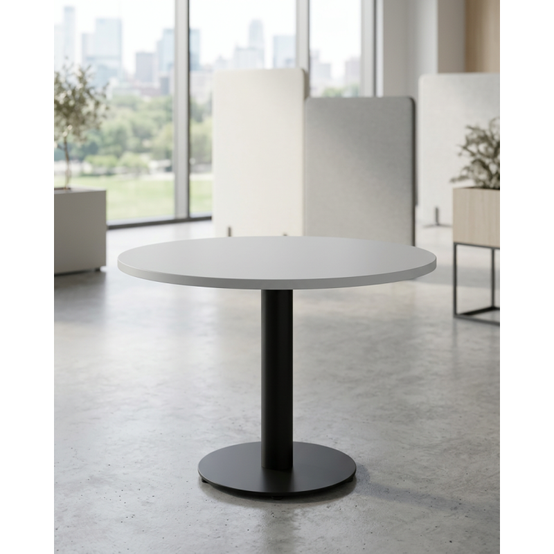 Es una mesa circular con un tablero de melamina, a elegir entre una gran variedad de acabados. Además, su pie de peana le aporta una gran estabilidad. El acabado de éste se podrá elegir entre epoxi color negro, blanco o aluminio.