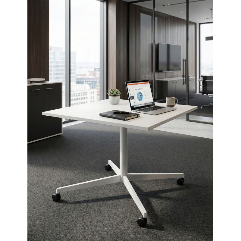 La mesa es cuadrada y tiene unas medidas estándar de 90x90 cm, lo que la hace lo suficientemente grande para realizar trabajos y reuniones en grupo. Además, la mesa está equipada con ruedas para facilitar su desplazamiento, lo que la convierte en una opción práctica y funcional para un entorno de trabajo dinámico. Las ruedas están diseñadas para no rayar el suelo y para permitir un fácil movimiento de la mesa, lo que hace que sea fácil de mover a cualquier parte del espacio.