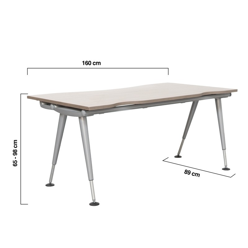 Esta mesa de oficina combina diseño funcional y materiales resistentes para adaptarse a cualquier espacio de trabajo. Con unas dimensiones totales de 160 cm de ancho, 89 cm de fondo y 74 cm de alto, ofrece una superficie amplia y cómoda para el día a día.