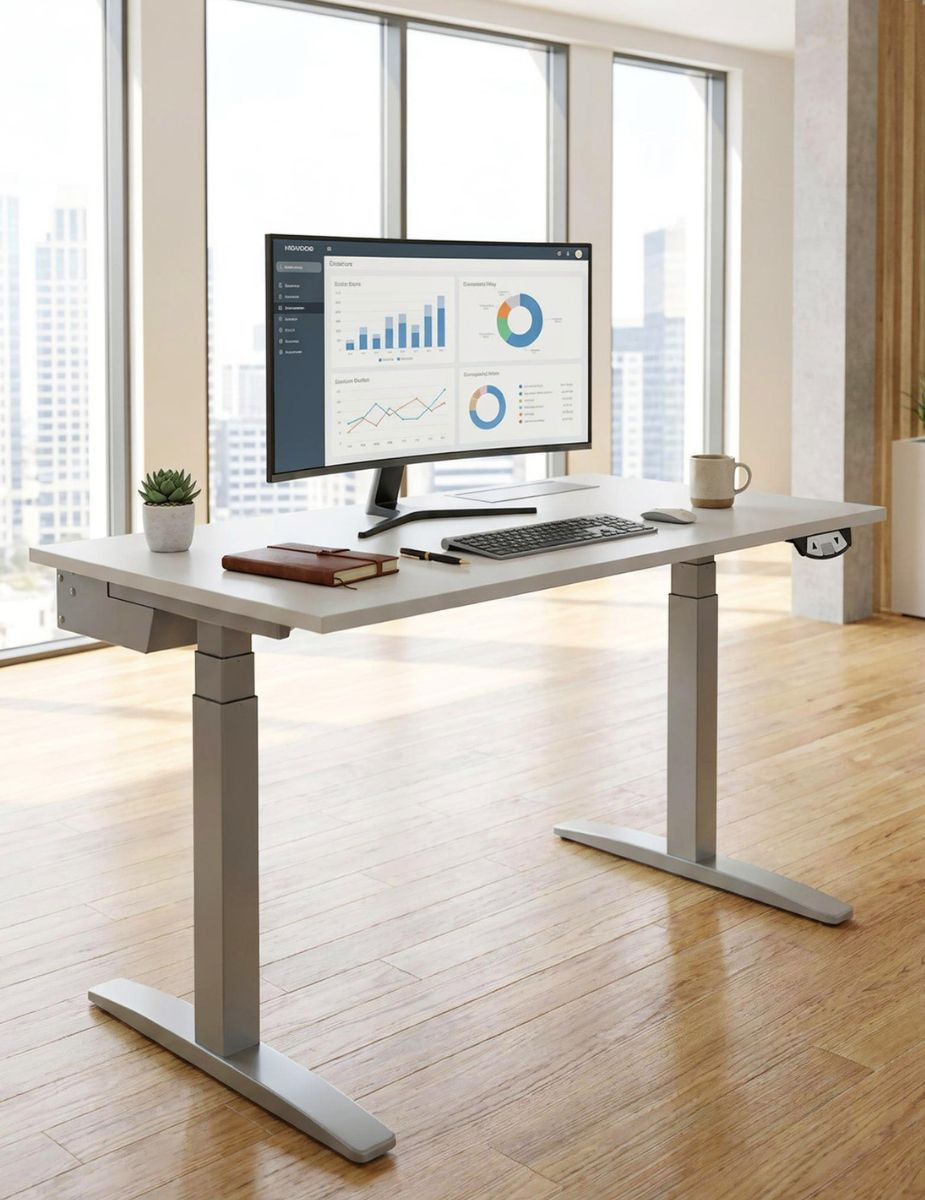 Como valor añadido, esta mesa cuenta con elevación motorizada controlada a través de botones, lo que permite ajustar la altura de forma cómoda y rápida según las necesidades del usuario. En conjunto, es una mesa práctica, resistente y pensada para un trabajo más dinámico y ordenado.