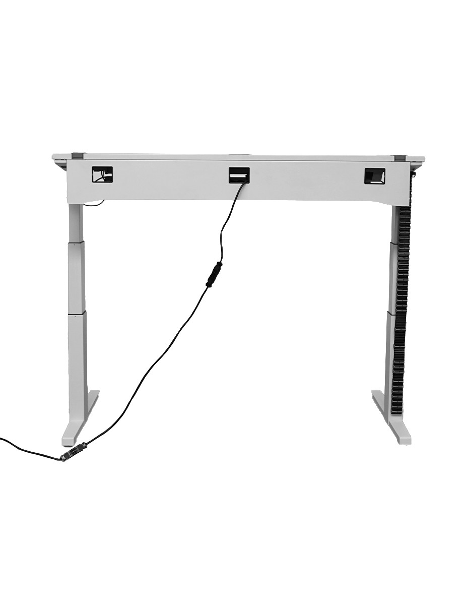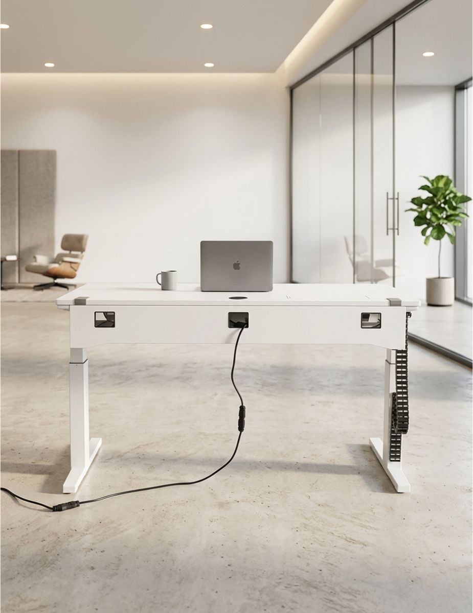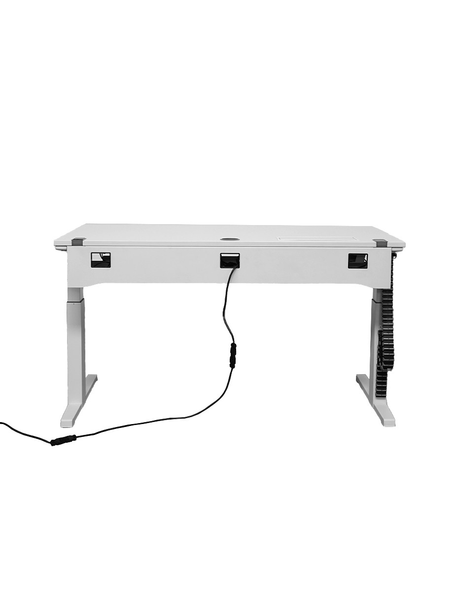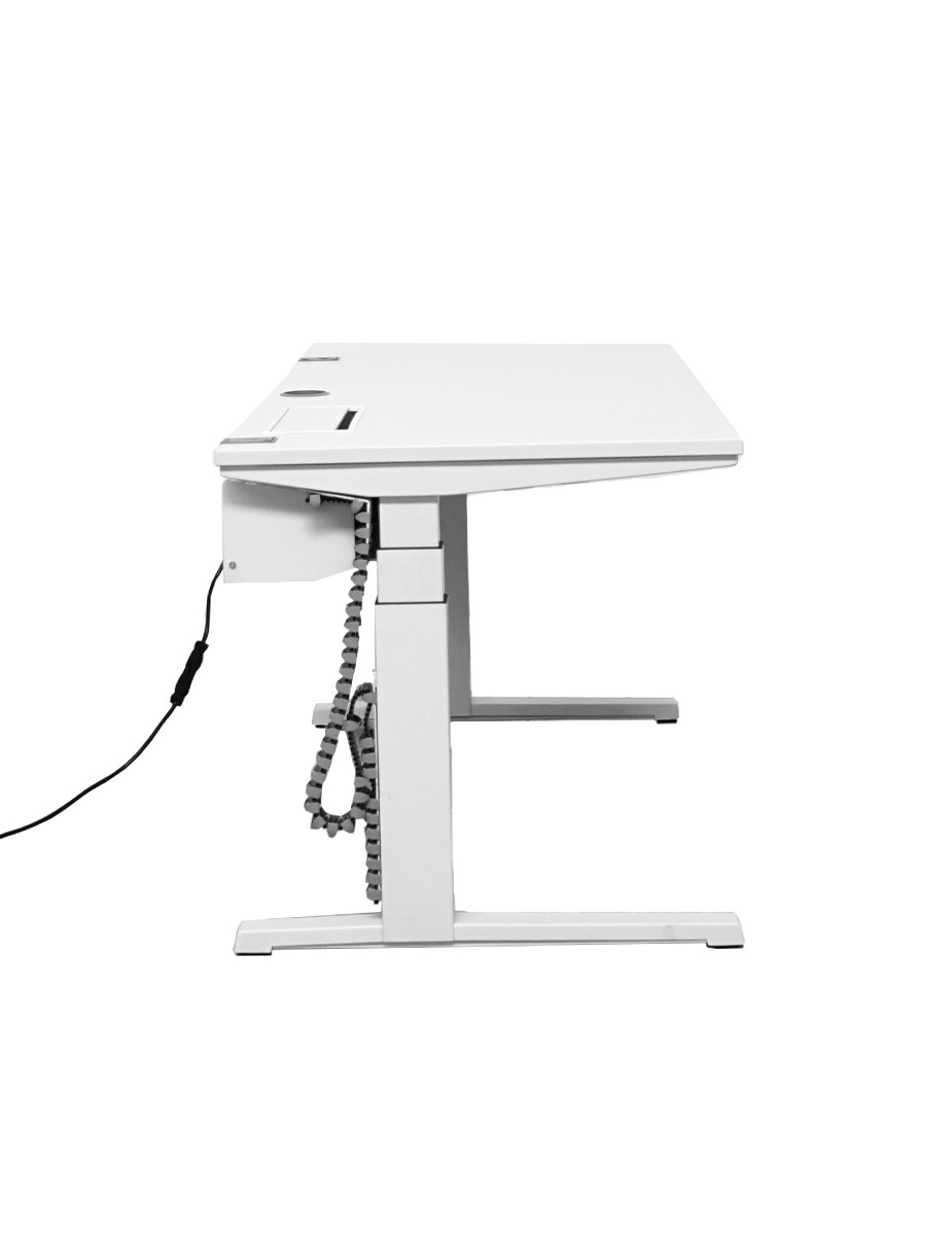 El tablero de melamina en acabado blanco aporta una estética limpia y luminosa, mientras que la estructura metálica elevable motorizada en blanco garantiza estabilidad, precisión y resistencia en el uso diario.