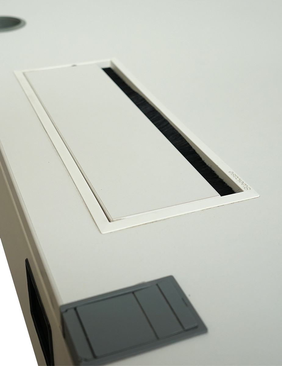 Incorpora una tapeta pasacables metálica blanca, facilitando una gestión ordenada del cableado, y una bandeja de electrificación frontal metálica también en blanco, pensada para integrar conexiones de forma práctica y discreta.