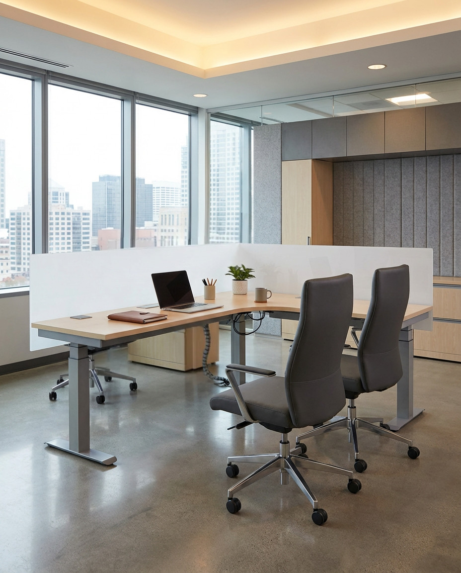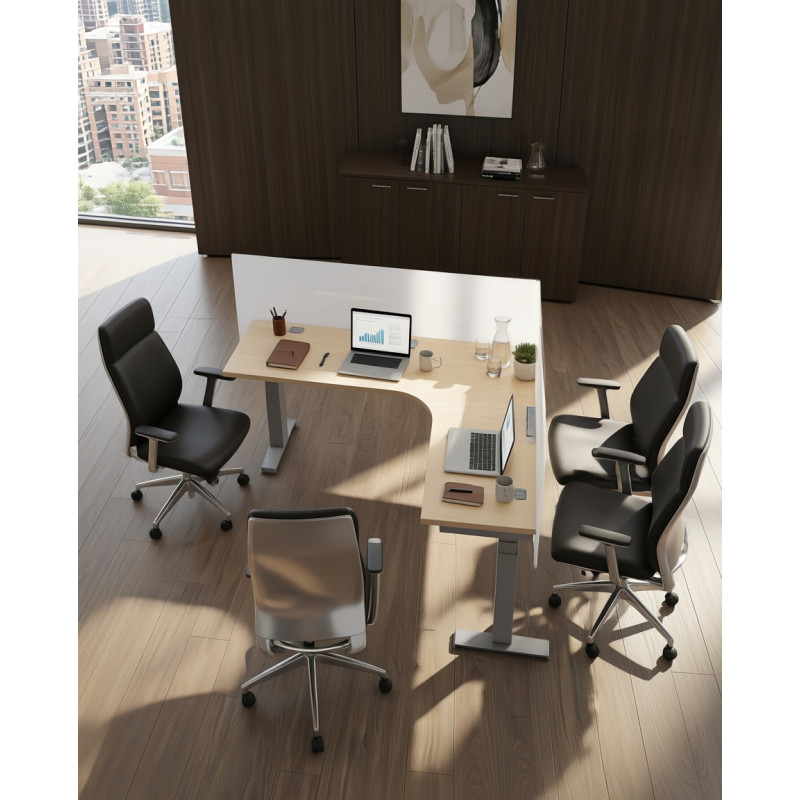 Esta mesa operativa en L con elevación eléctrica está pensada para crear un puesto de trabajo amplio, cómodo y preparado para las necesidades actuales de oficina. Su estructura incorpora una base de 3 patas T metálicas en acabado gris, que aporta estabilidad, resistencia y una imagen profesional para un uso intensivo.