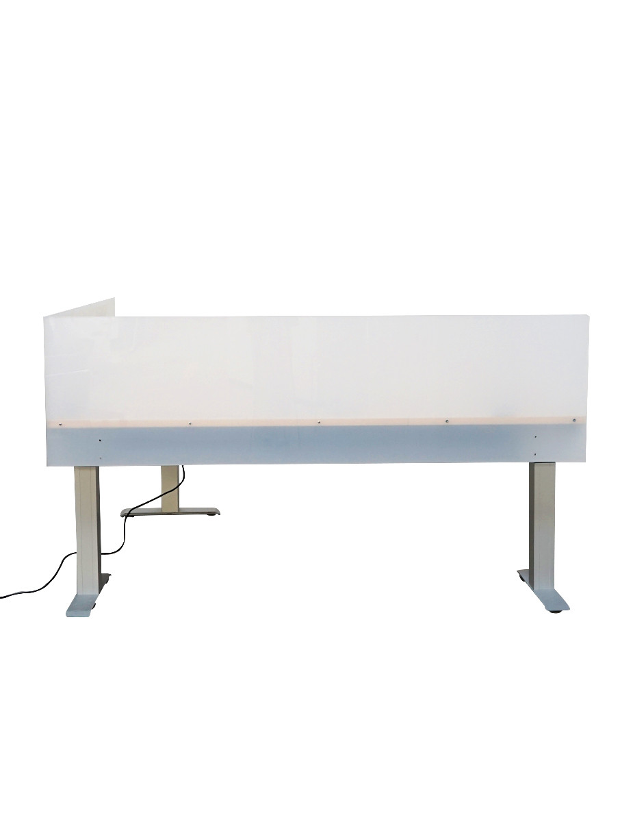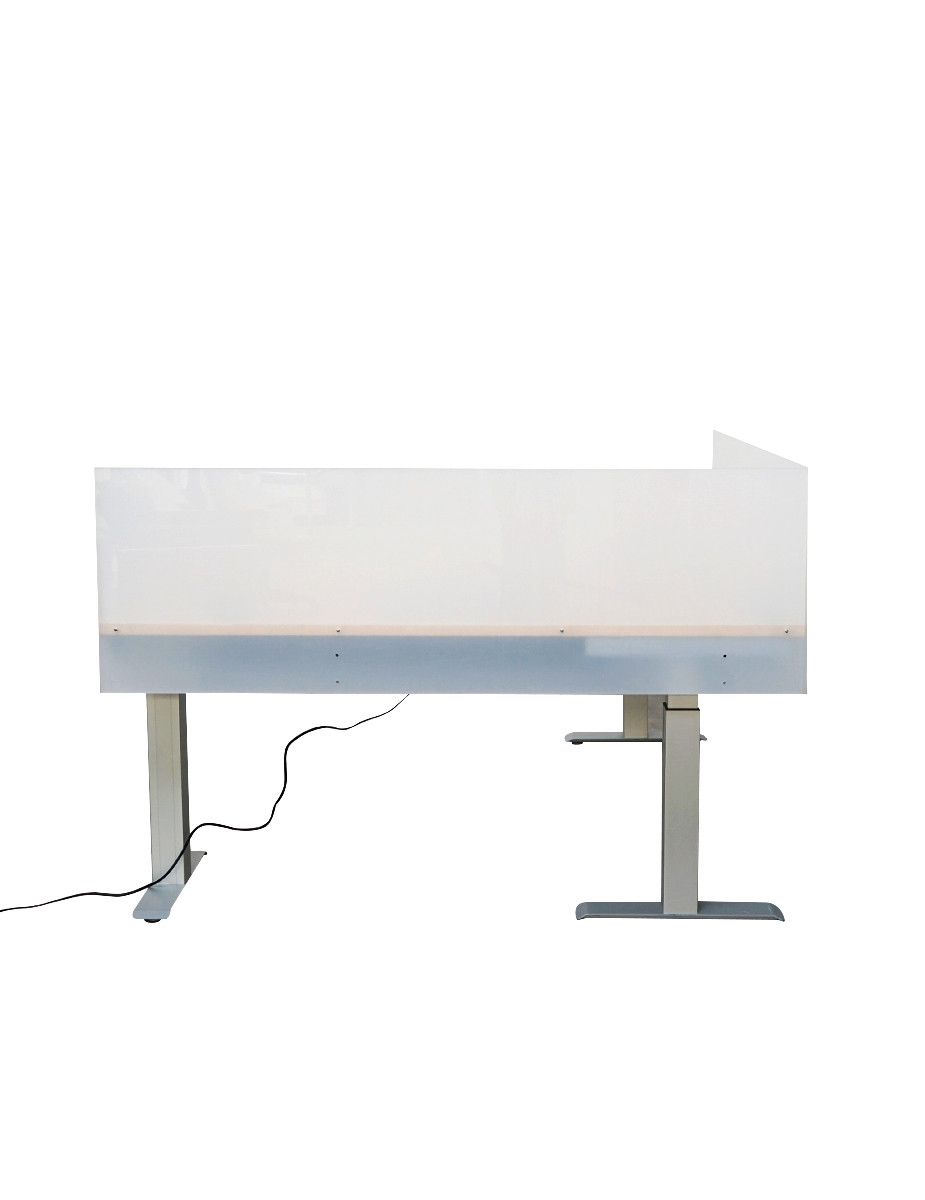 Esta mesa incorpora un sistema de elevación eléctrica mediante motor integrado, permitiendo adaptar la altura de forma cómoda y rápida según las necesidades del usuario. También cuenta con una divisoria frontal de metacrilato translúcido en acabado blanco, que aporta separación visual, y una bandeja de electrificación, perfecta para mejorar la conectividad y mantener el puesto más organizado.