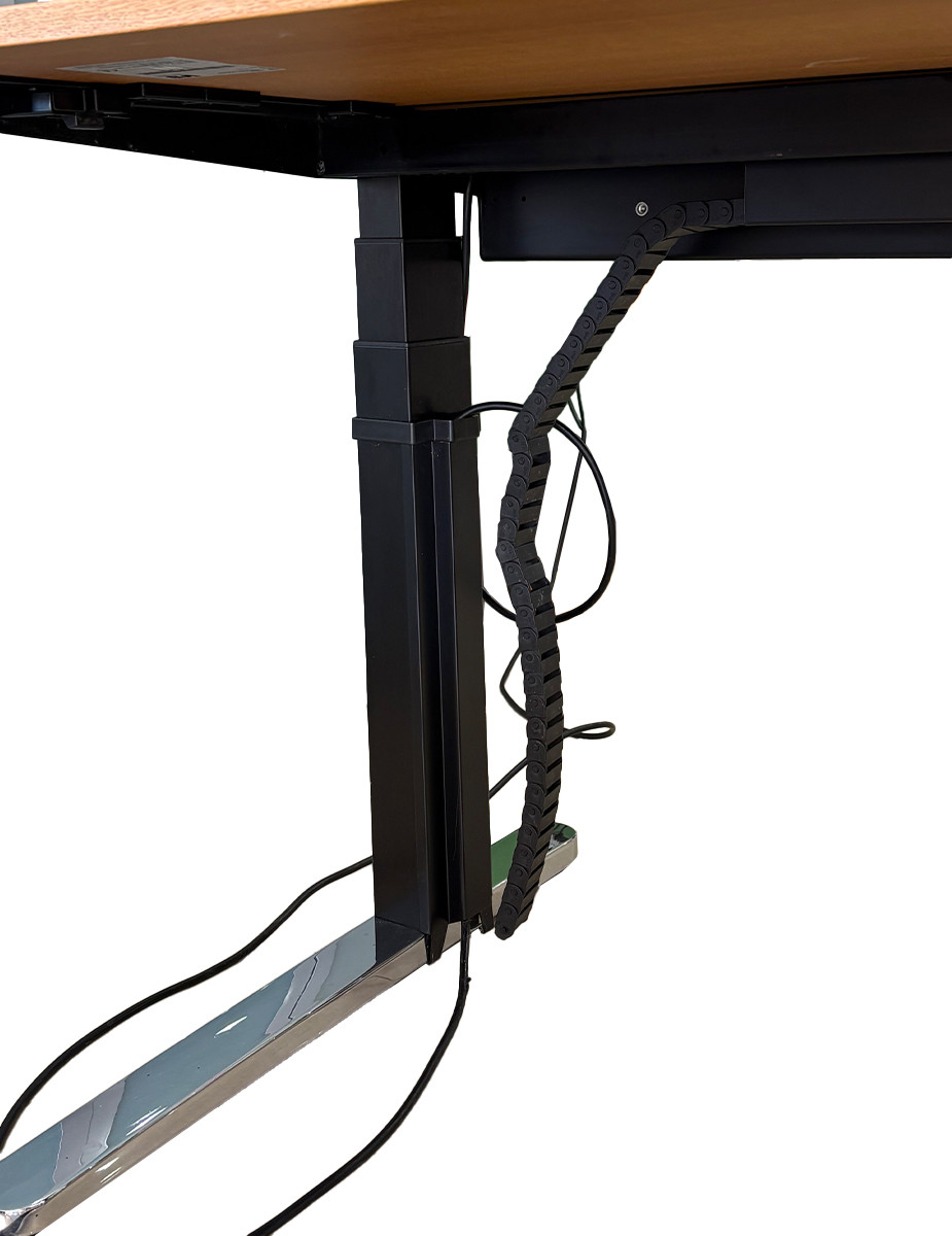 Incorpora estructura elevable motorizada, permitiendo alternar fácilmente entre trabajo sentado y de pie. El ajuste se realiza mediante panel de control táctil, que facilita una regulación precisa de la altura. Además, dispone de tapeta con enchufes integrada, optimizando la conectividad y la gestión del espacio.