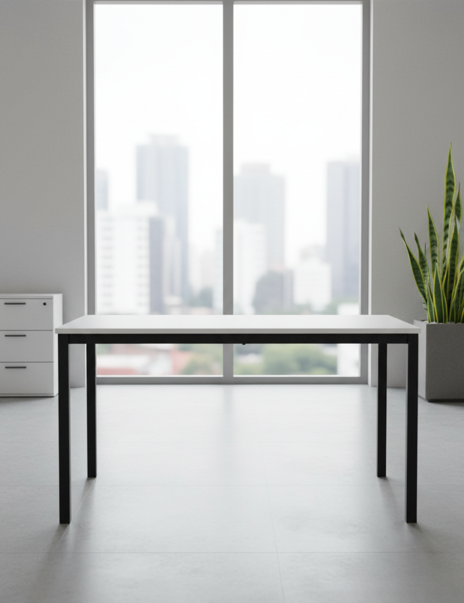 El tablero está fabricado en melamina blanca de alta calidad, lo que garantiza una superficie resistente y fácil de limpiar. La estructura metálica negra de 4 patas aporta estabilidad y durabilidad, además de un toque elegante y contemporáneo que se integra perfectamente en cualquier ambiente profesional o de estudio.